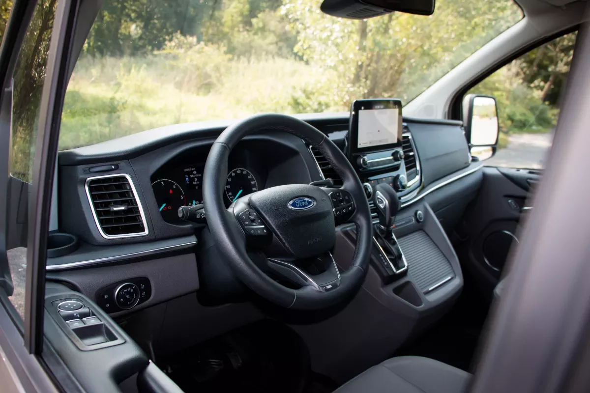 Jednoduchého aranžmá se Traveller drží i uvnitř. Celou šířkou se táhne velký kus černého plastu, do kterého jsou zasazené budíky, displej multimédií a ovládání klimatizace, zatímco Tourneo se snaží přiblížit více osobním autům, takže si designéři tvarově trochu více pohráli a doprostřed zasadili displej infotainmentu po vzoru tabletů.
