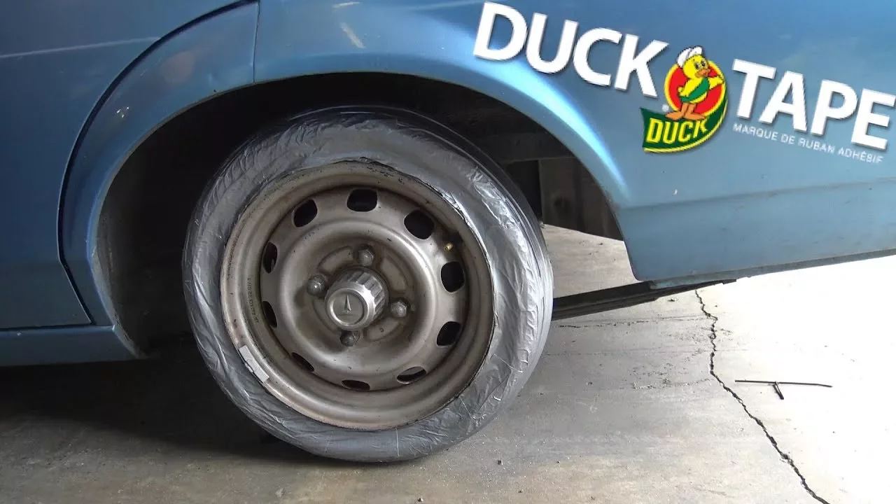 Rozverná tlupa individuí přebývajících většinu času v přítmí garáže se rozhodla otestovat, zda se dá pneumatika nahradit hromadou lepící pásky. Naskočili do své mikrododávky, v místní sámošce vykoupili letité zásoby stříbrné pásky a následně drahnou dobu se snažili oblepit ocelový disk staré Toyoty.