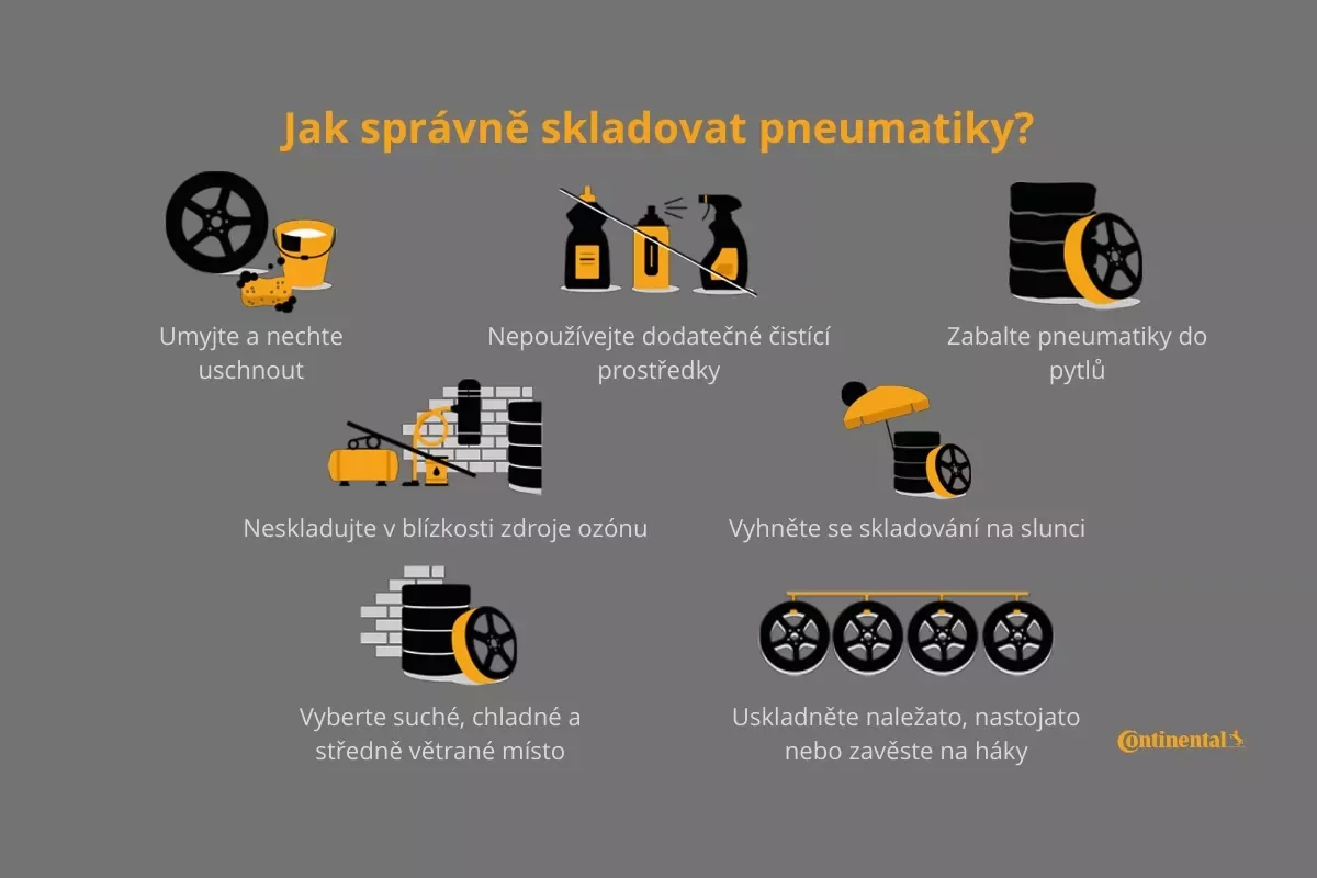 Kromě dodržování základních pravidel pro skladování existuje rozdíl i v tom, zda odkládáte jen pláště, nebo celá kola. Obecně lze uplatnit obě varianty.