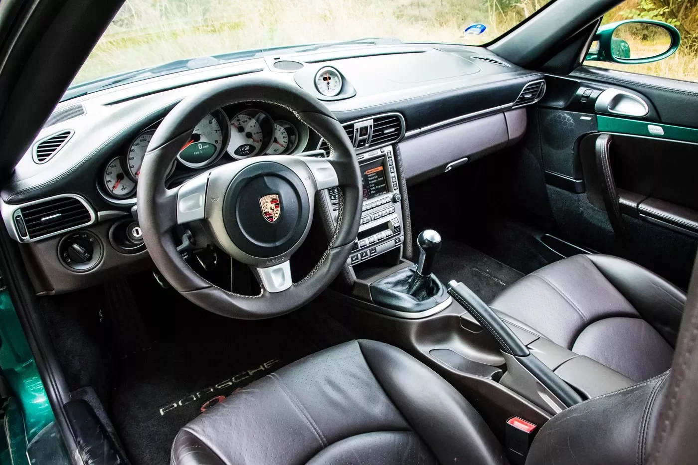 Pětice bílých budíků ukazuje všechny důležité údaje, mezi nimiž nechybí ani teplota a mazací tlak motorového oleje. Horní části palubní desky dominují příplatkové stopky, které byly dodávány jako součást balíčku Sport Chrono. Devětsetjedenáctka generace 997 se pořád startuje klasickým klíčem a spínací skříňka se nachází na místě, které je pro Porsche typické. Zapalování umístěné nalevo od volantu je starý trik ze závodů Le Mans, kdy závodníci mohli jednou rukou startovat motor, zatímco druhou rukou řadili jedničku. Každá vteřina získaná na startu se počítá.