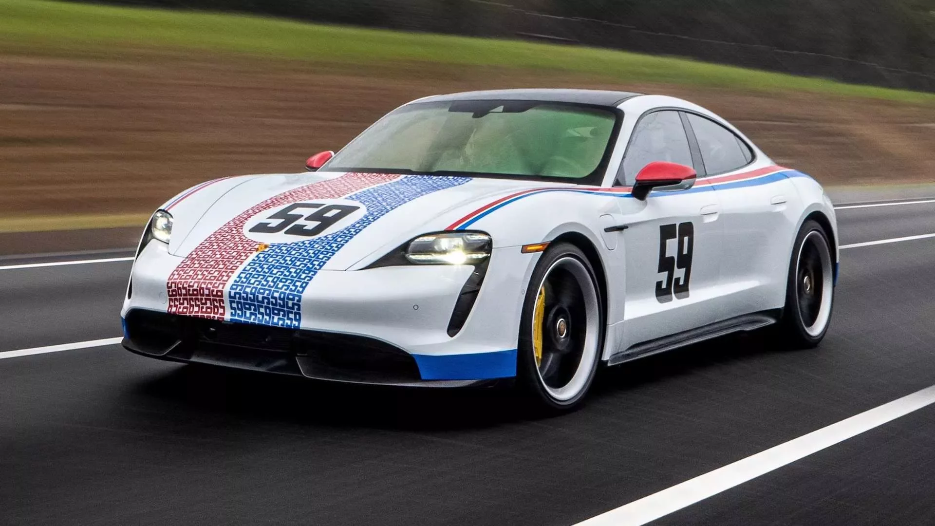 Poslední Taycan v bílé barvě s červenými a modrými pruhy vzdává hold Porsche 911 Carrera RSR, které v roce 1973 získalo první ze čtyř vítězství ve čtyřiadvacetihodinovce v americké Daytoně.
