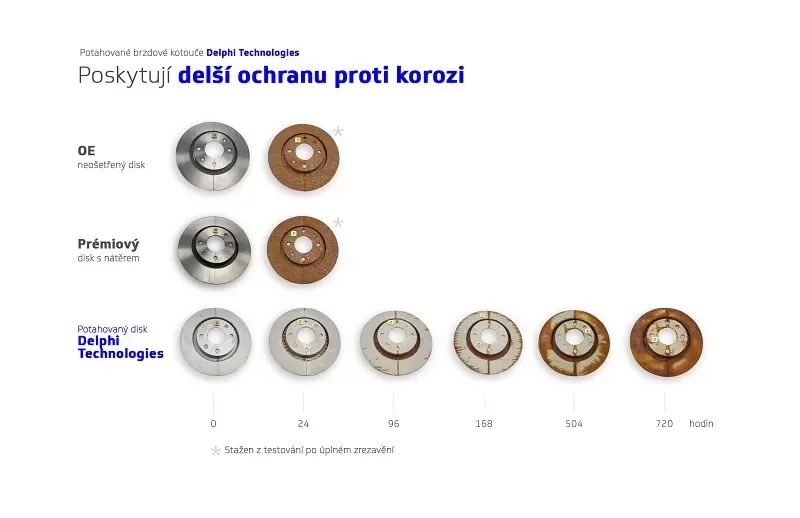 Nezávislá specializovanámateriálová laboratoř provedla srovnávací testování produktů za použití populární aplikace PSA. V souladu s předpisy ASTM B117-16 laboratoř vystavila natřené brzdové kotouče Delphi Technologies, OE a pět předních konkurentů na aftermarketu 720 hodinám intenzivního solního postřiku. Po 24 hodinách vykázal potahovaný brzdový kotouč Delphi Technologies pouze mírnou korozi na několika místech. V průběhu celého testu si zachoval neustále silný výkon. Na rozdíl od něj podlehly jak OE, tak i prvotřídní natřené kotouče celkové korozi do 24 hodin a byly z testu odebrány, čímž se zvýraznil rozdíl mezi plně potahovanými, lakovanými a obyčejnými kotouči.