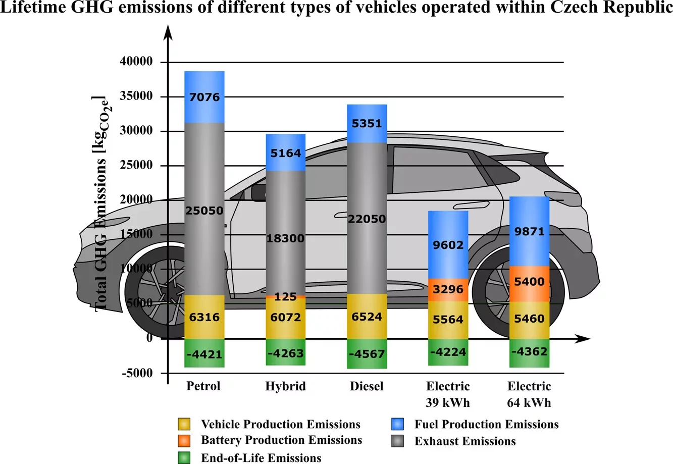 Ačkoli Česko patří v rámci Visegrádské čtyřky k zemím s poměrně vysokými emisemi při výrobě elektroaut (oproti Maďarsku a Slovensku), vykazuje také vysoký potenciál na jejich snížení oproti benzinovým a dieselovým vozům. Oproti benzinovým autům si můžeme dle brněnské studie polepšit až o 46 procent, v případě naftového pohonu až o 39 procent.