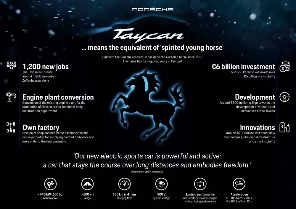 Co tedy nový elektrický Taycan? Víme, že vychází z koncepční studie „Mission E“ – mimochodem toto označení se mezitím stalo symbolem kompletní elektrické ofenzivy značky Porsche – a znamená „čilý, mladý kůň“, přičemž podle výrobce čerpá inspiraci z centrální části loga Porsche, v níž je od roku 1952 skákající kůň. Takže žádná souvislost s italskou konkurencí zde vážně není!