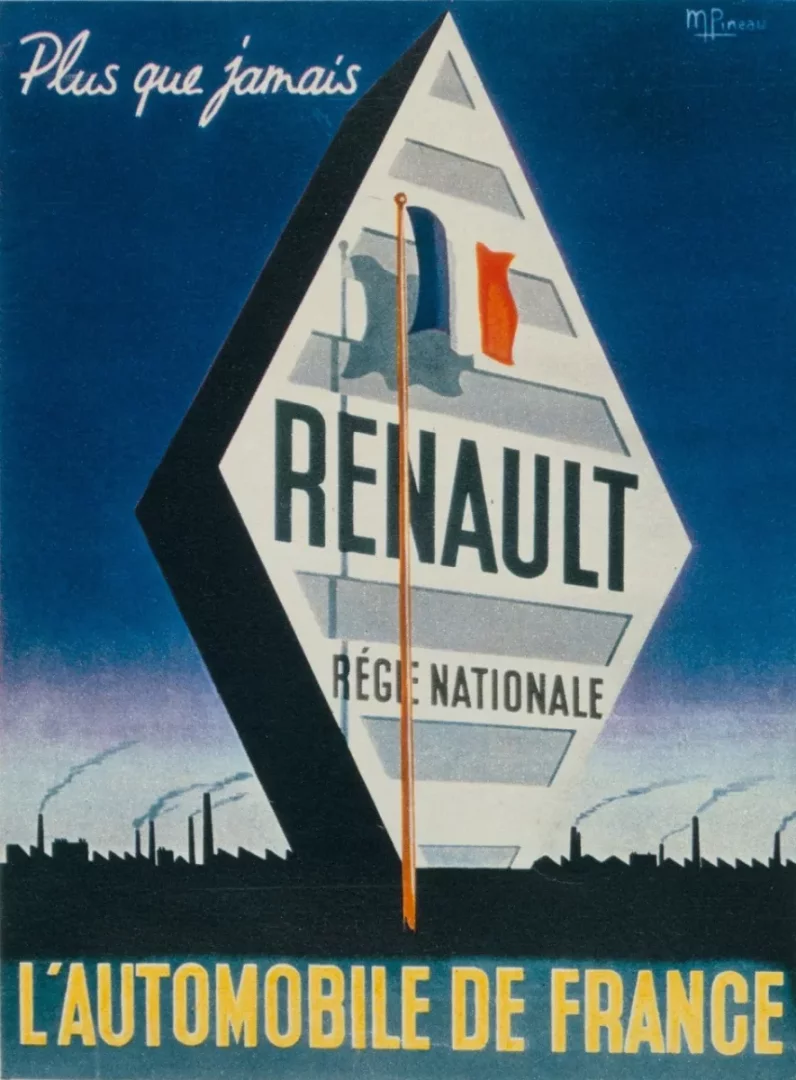 Znárodněním podniku na základě usnesení ze dne 16. ledna 1945 došlo ke změně ve statutu značky, která se stává podnikem se státní správou s názvem Régie Nationale des Usines Renault. Název „Renault“ je zachován pouze z obchodních důvodů. Závazek značky zůstává, minimálně se vyvíjí a potvrzuje kapitálovou změnu: „Renault je více než kdykoli předtím francouzským automobilem".