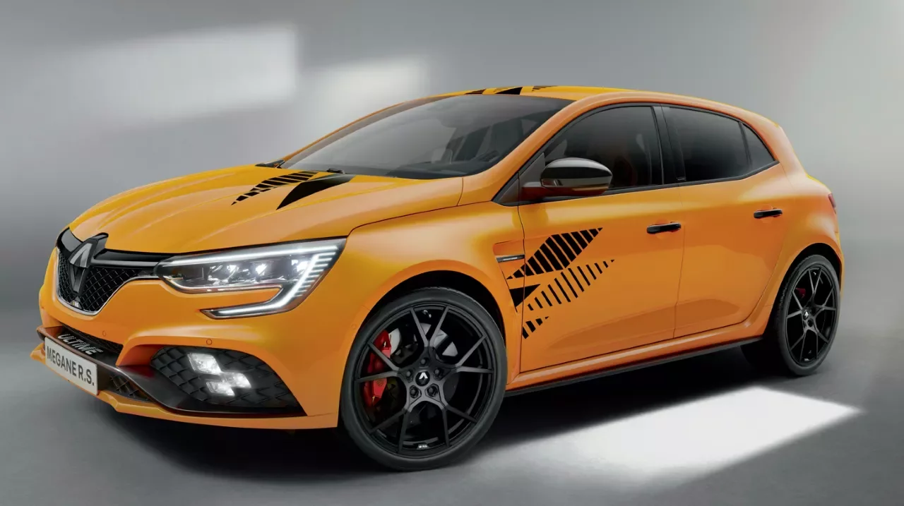 Mégane R.S. Ultime má exkluzivní design, který přebírá vizuální kódy Renault Sport s dvojitým diamantem, včetně specifické grafiky inspirované designem loga Renault. Tyto lišty se rozprostírají na střeše a kapotě (s výjimkou volitelného střešního okna), zadním nárazníku, dveřích a blatnících. Jejich černá barva ladí se čtyřmi barvami karoserie: černá Etoilé (bez příplatku), kde pruhy elegantně splývají, bílá Nacré nabízí velmi grafický vzhled, žlutá Sirius přebírá symbolické barvy Renault Sport nebo oranžová Tonic pro výrazný kontrast. Na pravém pruhu je také nenápadně uvedeno datum vzniku společnosti Renault Sport, rok 1976.
