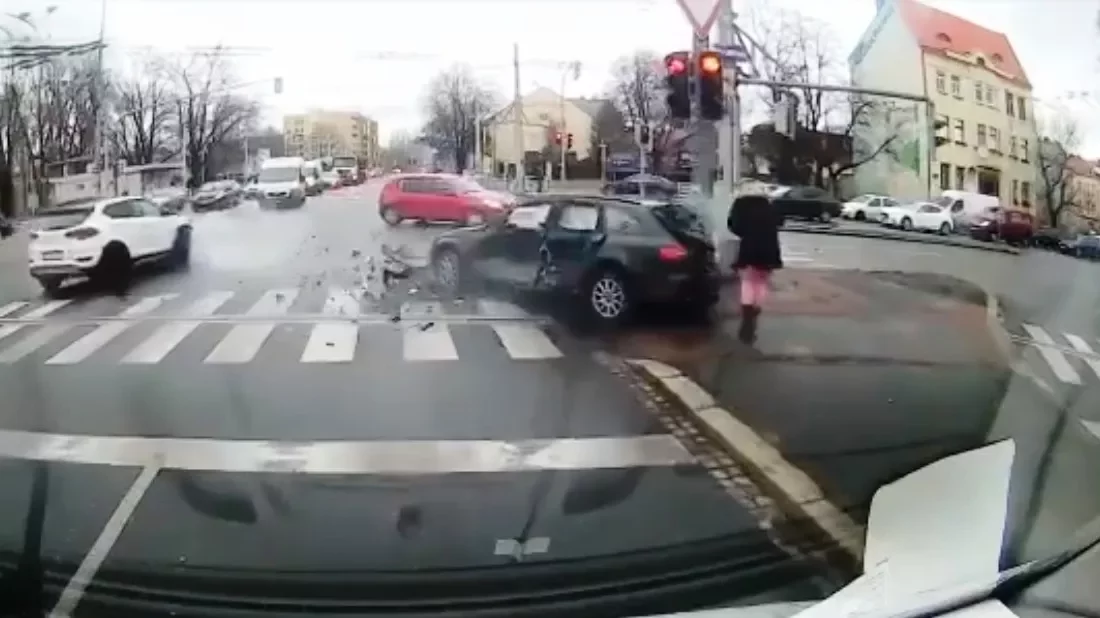Brutální dopravní nehodu zaznamenal palubní kamera v Ostravě. Řidič černého Audi A4 Avant projel křižovatku na červenou, načež do něj z boku narazil bílý Hyundai Tucson, který se právě rozjížděl spolu s dalšími auty na zelenou.