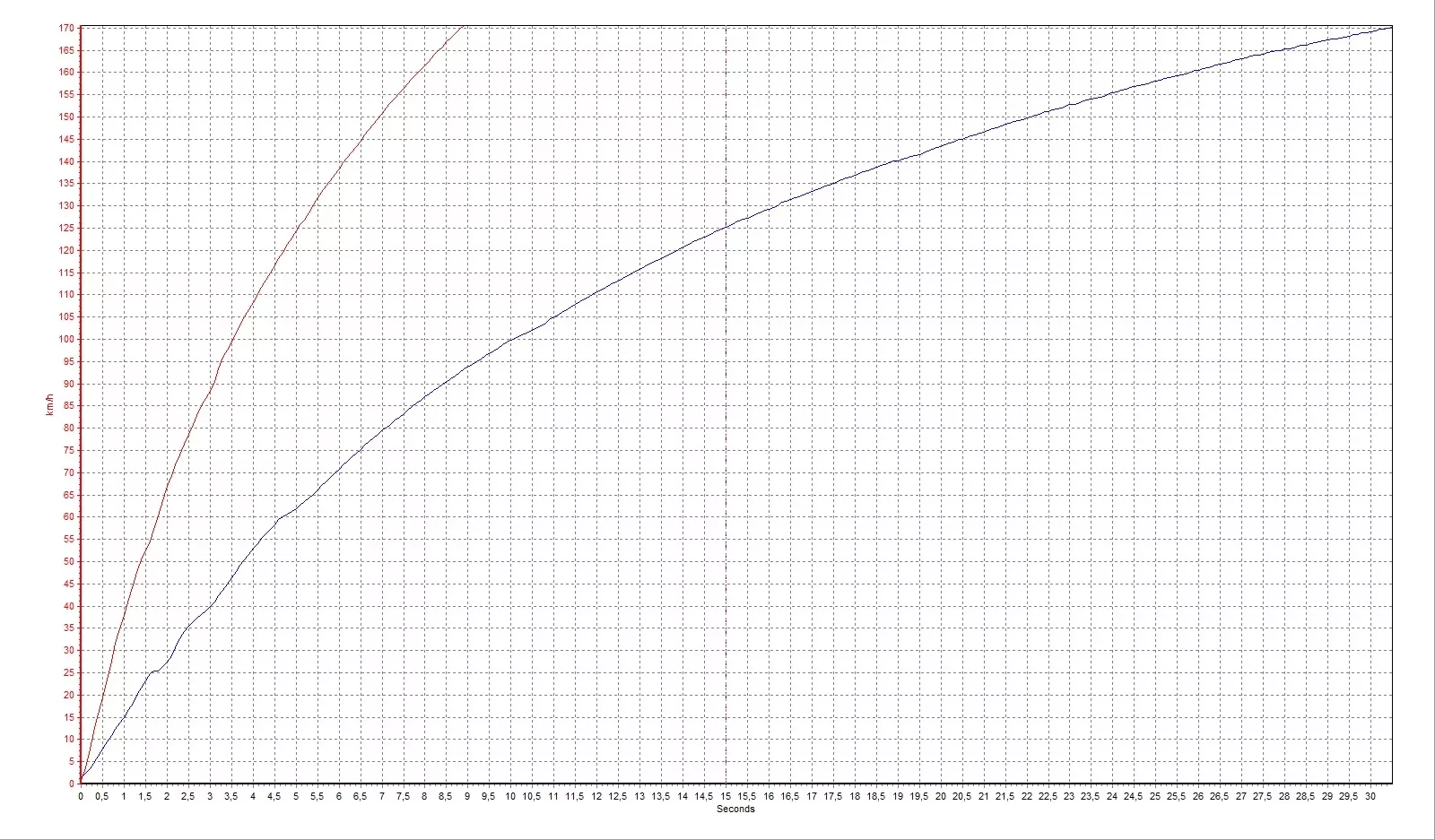Abyste si ale udělali ještě o něco lepší představu o rychlosti trojkového Touringu, můžete se podívat níže na graf porovnávající tohle BMW s Octavií 2.0 TDI (150 k) aktuální generace osazenou automatickou převodovkou DSG. Ve chvíli, kdy M3 Touring jede 170 km/h (to je ta červená čára), běžné naftové rodinné auto nižší střední třídy, které nám zde zastupuje zmíněná Octavia (to je ta modrá čára), nedosáhlo ani 100 km/h. Mimochodem, u BMW údajně přemýšlí, zda by na základě enormního zájmu o M3 Touring nenabídli ještě také model M3 CS s karoserií kombi, který bude ještě rychlejší. My jsme rozhodně pro!