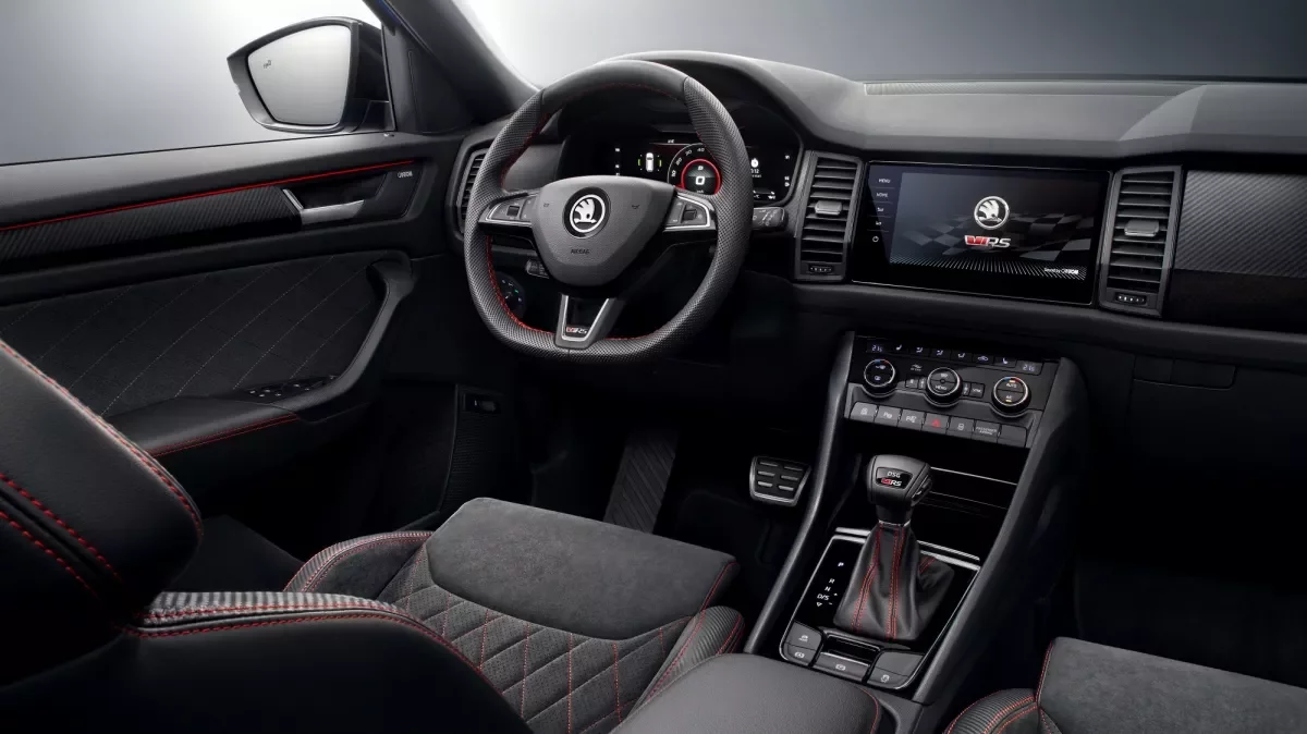 Sportovní multifunkční volant nese logo RS a je obšitý červeným kontrastním stehem. Výplně dveří jsou potažené Alcantarou s černým křížovým prošíváním. Sportovní charakter vozu Škoda Kodiaq RS doplňuje palubní deska s karbonovým vzhledem, černý strop a kryty pedálů z ušlechtilé oceli. Vysoce výkonné SUV navíc nabízí i všechny obvyklé přednosti modelové řady Kodiaq: dostatek místa pro pět nebo sedm osob, velkorysý zavazadlový prostor a celou řadu Simply Clever prvků typických pro modely značky Škoda.