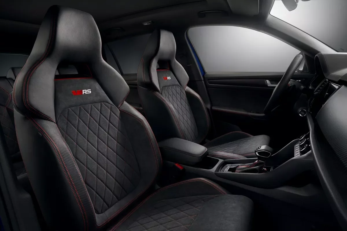 Škoda Kodiaq RS má ve standardní výbavě sportovní sedadla s integrovanými hlavovými opěrkami potažené materiálem Alcantara, který je často používán v motorsportu. Opticky působivá je výrazná perforace černého potahu a červené kontrastní obšití v designu Diamond Cross. Boky sedadel jsou potažené kůží v barvě karbonu a stejně jako středová loketní opěrka a opěrky ve výplních dveří jsou obšité červeným stehem.
