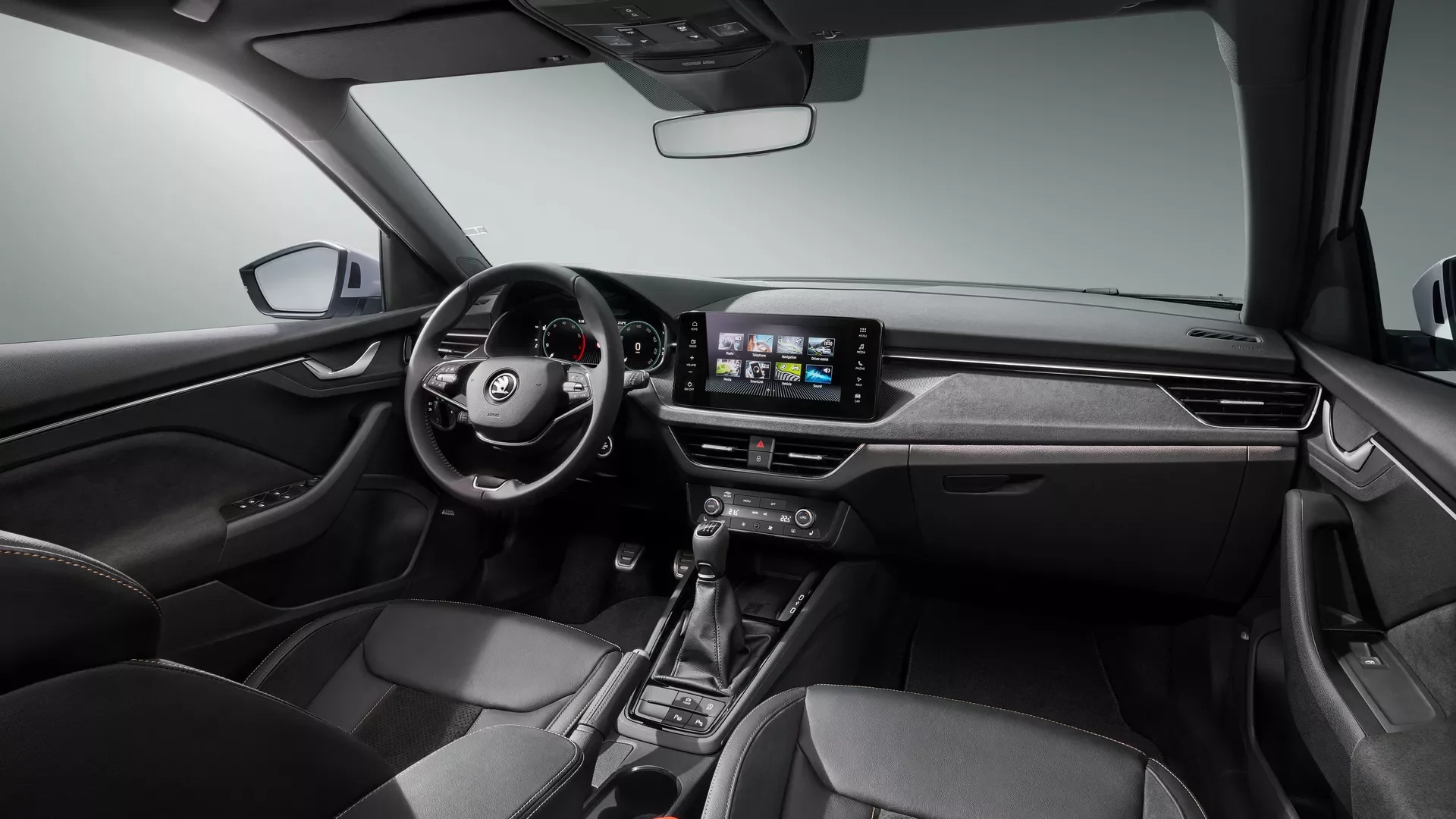 Přesuneme se nyní dovnitř. Změny u Kamiqu a Scaly jsou ve srovnání s jejich předchozími verzemi pouze nepatrné, prakticky se týkají jen elektroniky. Hlavní odlišností je, že zcela zmizely analogové budíky a jsou nahrazeny virtuálním kokpitem o velikosti 8 palců, za příplatek až 10,25 palců. Středový dotykový displej se zvětšil z 6,5" na 8,25" a pozměnilo se i ovládání klimatizace.