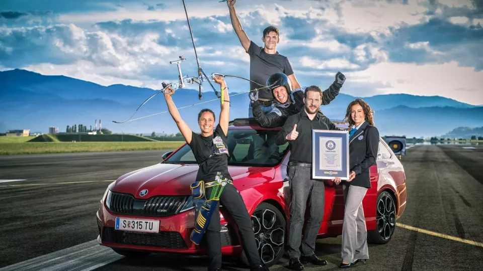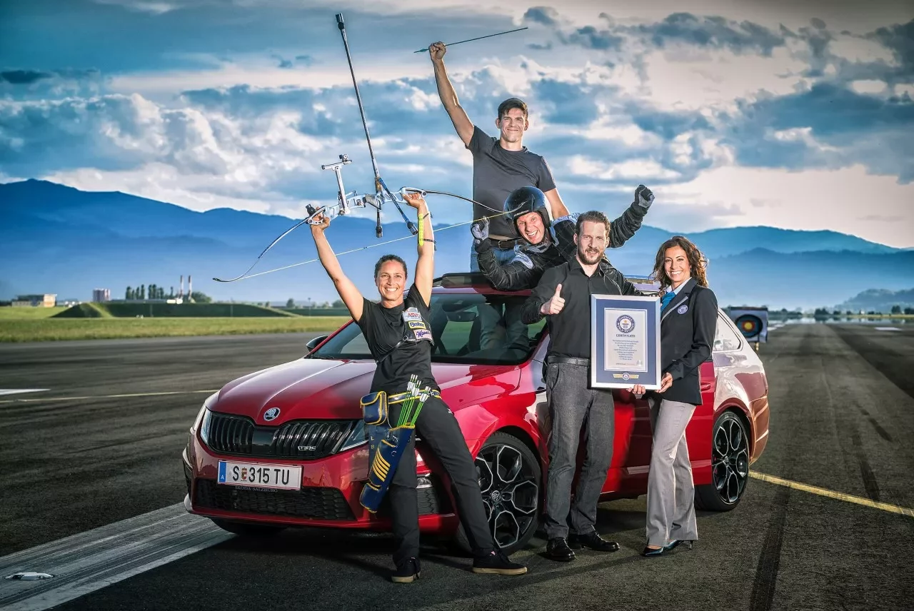 Do Octavie Combi RS245 řízené instruktorem Guidem Gluschitschem zástupci automobilky postavili mistra bojových umění Markuse Haase (ano, opravdu postavili – čouhal ven střešním okýnkem), rozjeli vůz na 215 km/h a následně nechali olympijskou lukostřelkyni Laurence Baldauffovou vystřelit šíp, který Markus Haas v letu chytil. Šíp před chycením uletěl rekordních 57,5m. Po měsících příprav se během okamžiku zapsala Škoda do Guinnessovy knihy rekordů. Je tedy jasné, že milovníci chytání šípů v letu si bez pochyb koupí Škodu Octavii Combi RS 245. V této disciplíně prostě nemá konkurenci.