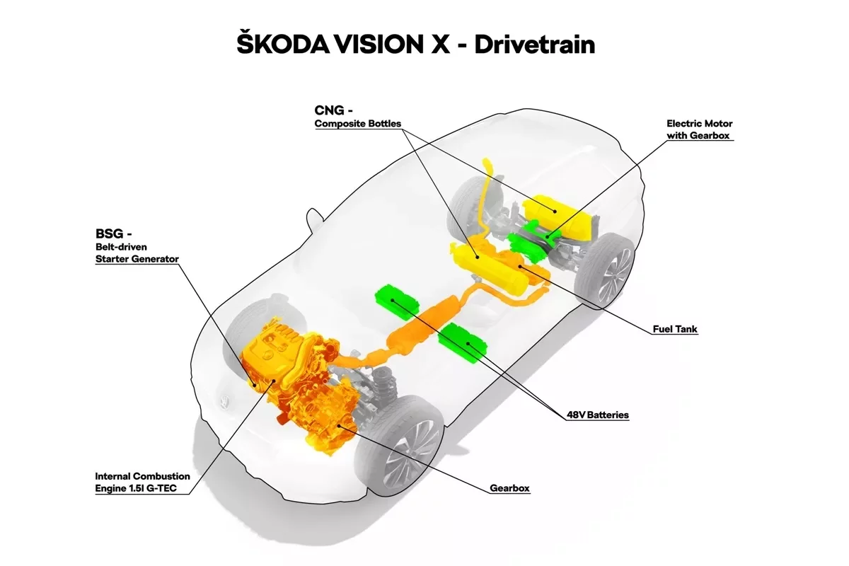 - ŠKODA VISION X je prvním hybridním vozem v historii značky ŠKODA poháněným zemním plynem, benzinem a elektřinou
