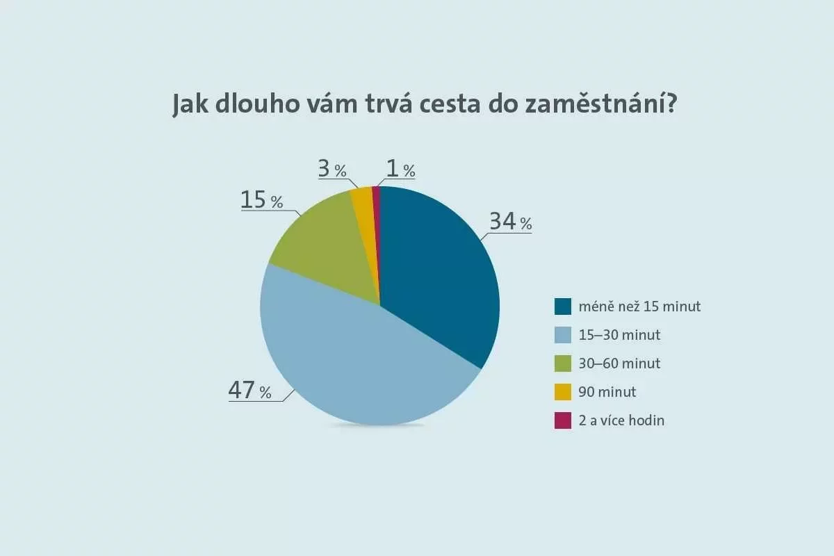 Dojezdové časy do práce jsou u Čechů pod celosvětovým průměrem. Ten činí hodinu a devět minut. Naproti tomu 81 % Čechů dojíždí do půl hodiny, nejčastěji, ve 47 %, je to 15–30 minut. „Češi se vyznačují nízkou pracovní mobilitou, a to nejen ve formě stěhování za prací, ale i dojížděním,“ vysvětluje Lukáš Cankař, ředitel marketingu a retailového prodeje ve Volkswagen Financial Services. Jen 4 % by byla ochotná se za prací přestěhovat, stejné procento by dojíždělo dál než 50 km.