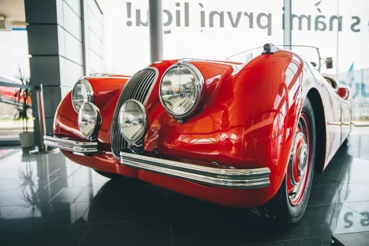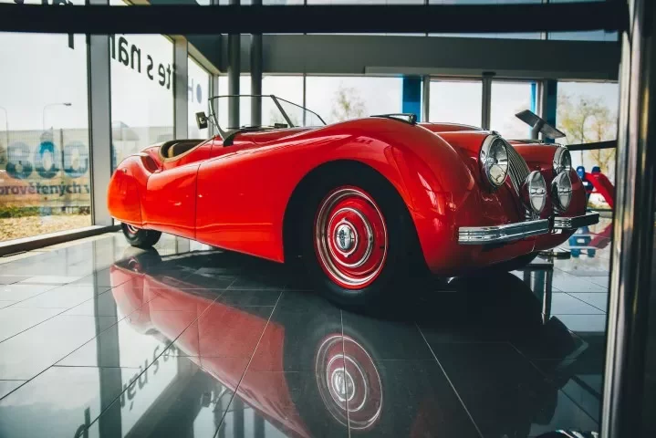 Velmi vzácný Jaguar XK 120 Alloy Roadster 1949 - s hliníkovou karoserií jich bylo ručně vyrobeno pouze 242 kusů (z toho 184 s levostranným řízením), a to na počátku výroby tohoto modelu, dokud výrobce z kapacitních důvodů nepřešel na ocelovou karoserii, což umožnilo rychlejší výrobu a tím uspokojení nečekaně velké poptávky. Rané hliníkové exempláře jsou nejen lehčí, ale vzhledem k mnohem menšímu počtu vyrobených kusů (242 z celkového počtu 7631 vyrobených XK 120) také výrazně cennější. Tento konkrétní exemplář prošel v druhé polovině 80. let kompletní náročnou renovací provedenou na špičkové úrovni dle tehdejších standardů.