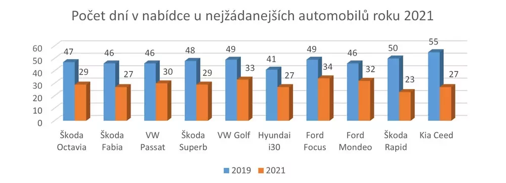 Zatímco v roce 2019 se na první příčky nejrychleji skupovaných ojetin dostaly Škoda Felicia, Suzuki Jimny nebo Mazda CX-7 s celkovými 27 až 37 dny v nabídce, v loňském roce se prodávaly nejčastěji za 22 až 25 dní a rozhodně nepatřily mezi ty nejrychleji se prodávající. V roce 2021 patří první příčky žebříčku nejrychleji prodávaných automobilů vozům Peugeot 106 (2 dny), Daewoo Matiz (10 dní) a prostornému MPV Renault Grand Espace (14 dní).