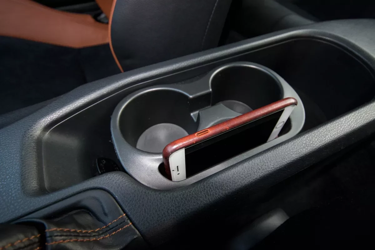Posuvný držák na nápoje je praktický a přesně se do něj vejde i telefon