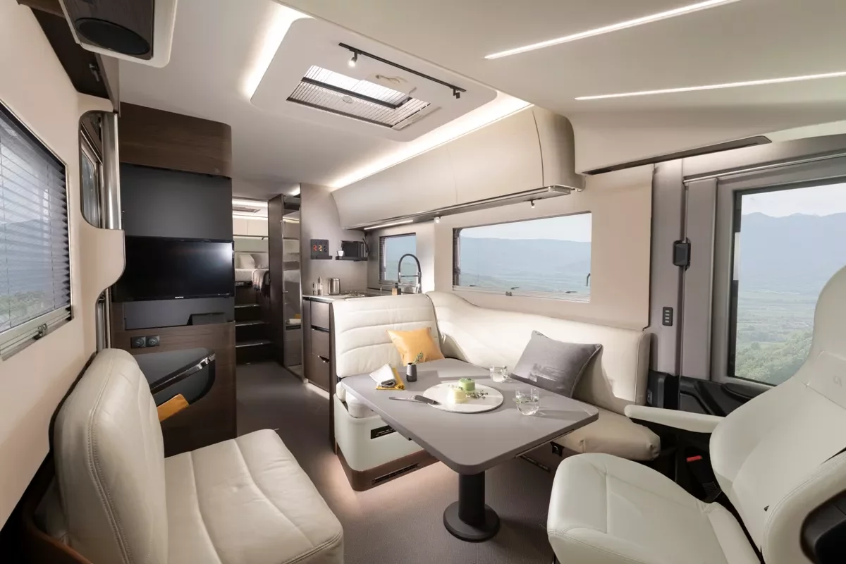 Vypíchnu alespoň hlavní highlighty. Vstoupíte dovnitř bočními dveřmi a ocitnete se v otevřeném obývacím pokoji s velkou rohovou pohovkou (s výsuvnými bezpečnostními pásy, aby při kempování nerušily) a dalším gaučem na protější straně. Samozřejmě můžete otočit i přední pohodlná křesla a vytvořit tak obří jídelnu.