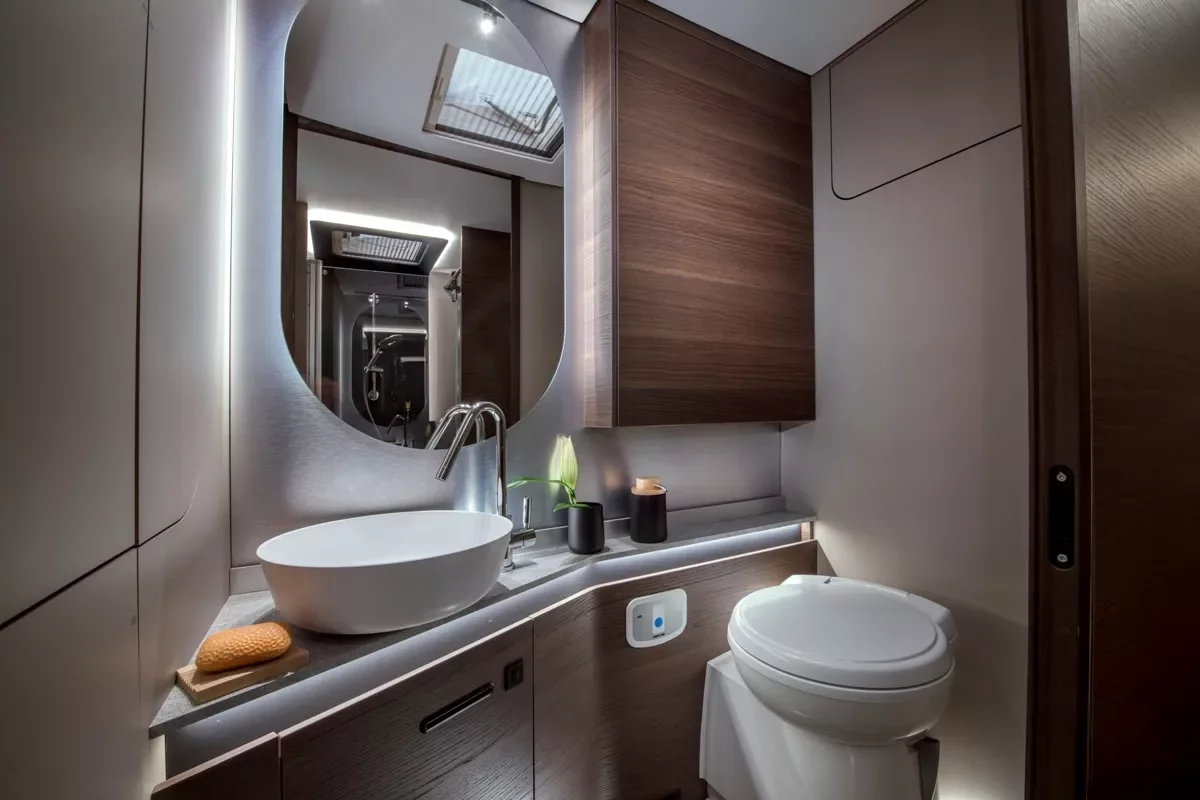 Postoupíte-li dále do vozu, po pravici najdete krásnou koupelnu v designu luxusního spa (na první pohled to vypadalo jako sauna, ale to už by bylo trochu moc) s královským prostorem ve všech směrech. Po levici se nachází oddělená toaleta, opět jako vystřižená z luxusního hotelu. Obývací prostor můžete navíc oddělit od koupelny dveřmi, takže máte naprosté soukromí.