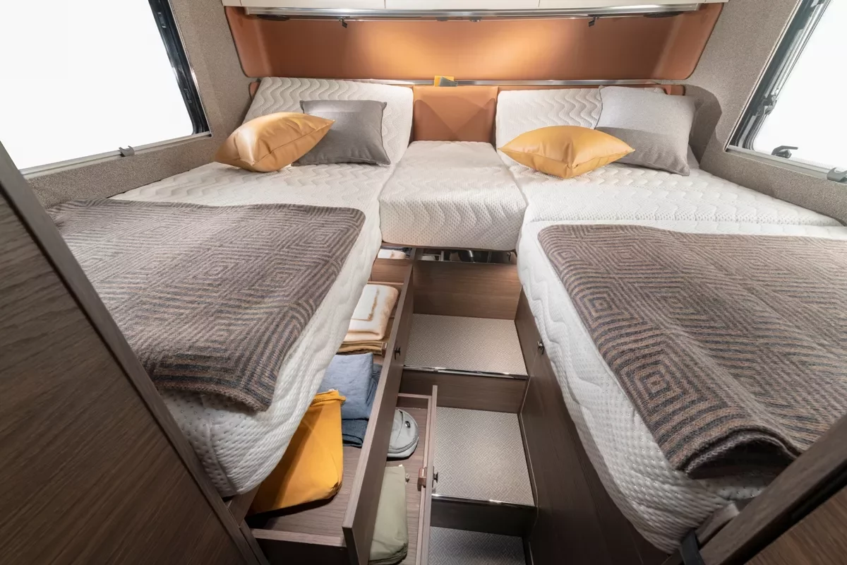 V ložnici pak na vás čeká plnohodnotná postel, žádné palandy jako na vojně. Podle konfigurace můžete mít v ložnici buď manželskou postel, nebo tři lůžka. Další dvě lůžka (opět plnohodnotných rozměrů) pak vždy najdete v tradiční alkovně nad kabinou.