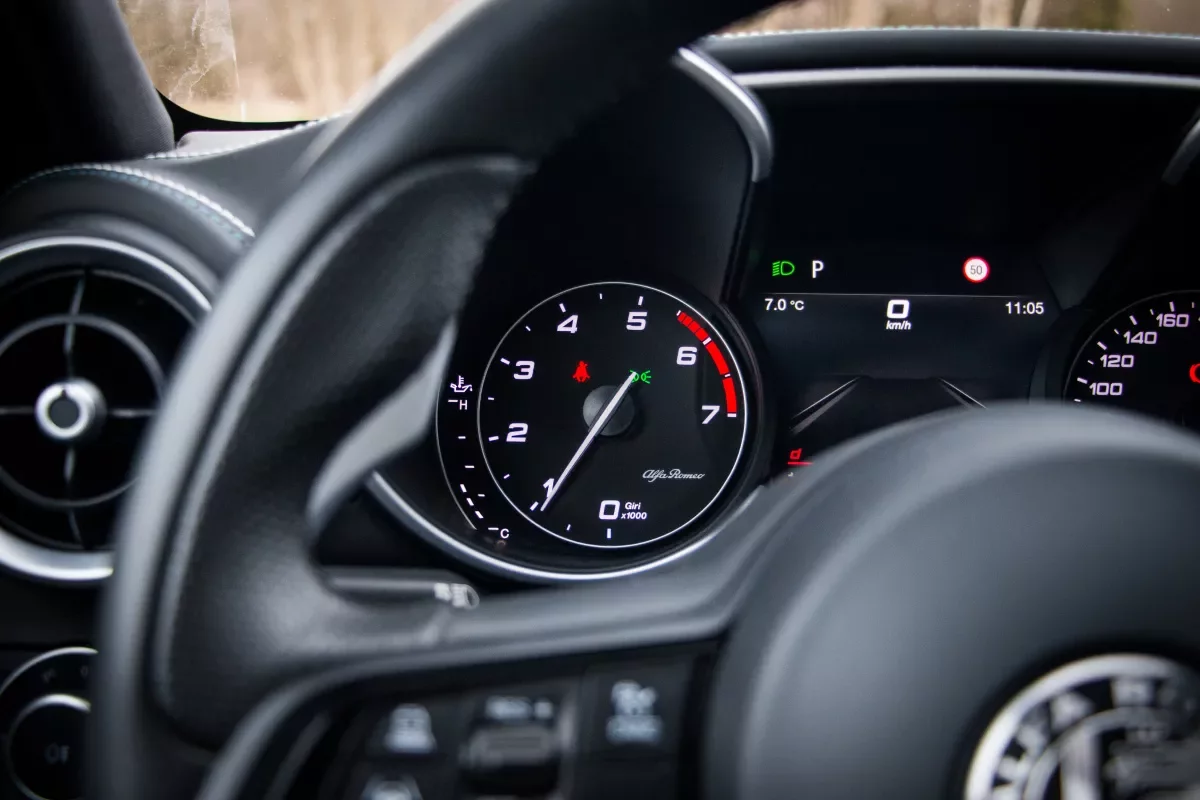 Červené pole otáčkoměru benzínového agregátu Giulie Veloce Ti totiž začíná na pouhých 5 500 otáčkách za minutu, čímž odhaluje nezajímavý charakter motoru, který je pro většinu nadšenců nepříjemným zklamáním.
