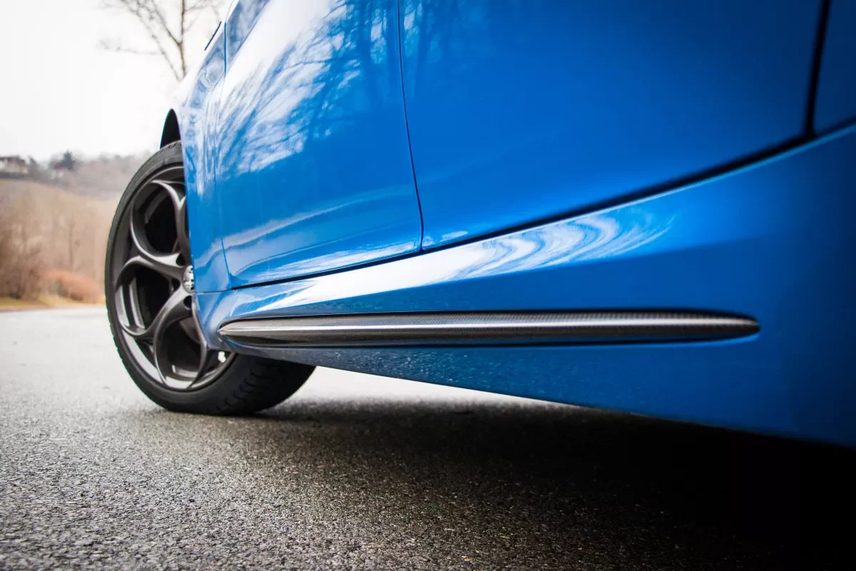 Modrá barva není pro Alfu Romeo typická a většina modelů sluší zejména italská závodní červená, ale testované auto s ní vypadá skvěle. Spojení tmavě modrého laku, tmavých kol a žlutých brzdičů Giulii Veloce vážně sluší a s příplatkovým balíčkem výbavy Ti (Turismo Internazionale) to celé ještě vylepšují karbonové doplňky z nejlepšího verze Quadrifoglio.