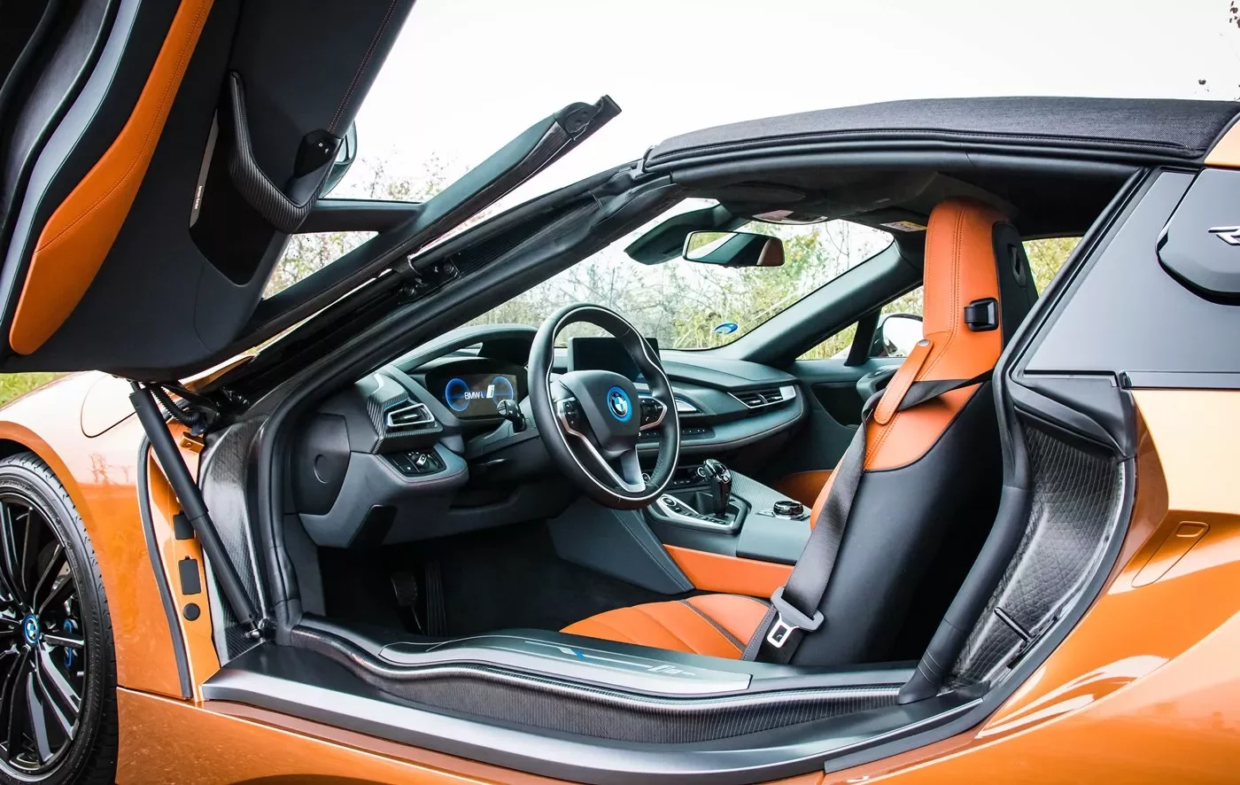 Měděný exteriér je v testovaném autě doplněn oranžovým koženým interiérem, který vypadá opravdu senzačně. Opravdu se mi líbí, protože zajímavě kontrastuje s neobyčejným obložením z nelakovaných uhlíkových vláken. Madla dveří a dekory palubní desky jsou malou ukázkou technologie, jejíž pomocí je BMW i8 vyrobeno. BMW si u modelů řady i zakládá na ekologičnosti a moderních technologiích, o čemž svědčí i extrémně pevný a lehký skelet karoserie, který je pomocí technologie CarbonCore vyroben z recyklovaných plastů vyztužených uhlíkovými vlákny. I kvůli tomu je posez za volantem oproti konkurentům trochu vyšší, protože podlaha monokoku slouží k uložení akumulátorů.