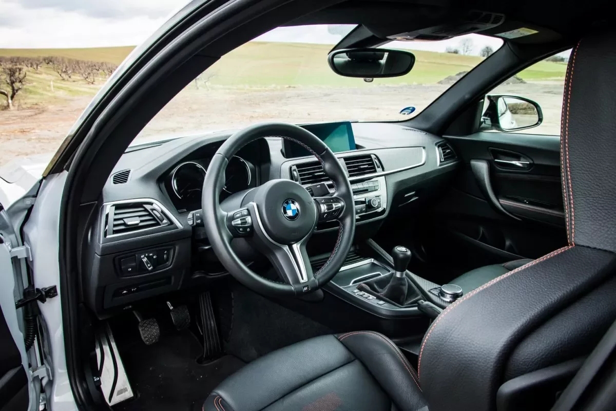 Uvnitř zůstalo vše při starém, ale takže máte nesmírně široký rozsah nastavení poloh sedaček a volantu, to BMW umí snad nejlépe na světě. Nohy máte před sebou, ne pod sebou, ruce krásně pokrčené, řadicí páku přesně v takovém místě, abyste ji našli v jakékoliv situaci, dva klasické ukazatele hezky za volantem a – dnes už v podstatě vyhynulý druh – mechanickou parkovací brzdu. Tedy ne, že by zrovna u M2 byl potřeba rozhazovat zadek právě ruční brzdou, ale pro ten pocit, že sedíte v autě, kde je opravdu vše na svém místě, je to důležitý detail.