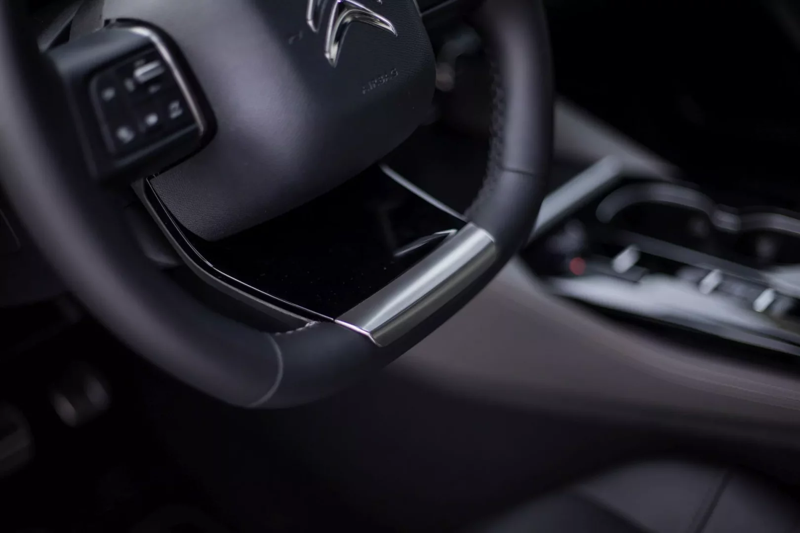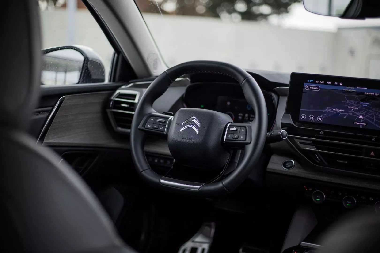 Uvnitř je Citroën C5 X o něco konvenčnější, ačkoliv jisté výstřednosti tu také najdete. Pryč jsou sice doby volantu s pevným středem (i když to bylo naprosto boží), ale třeba takový infotainment působí svojí pozicí a tvarováním dost nezvykle.