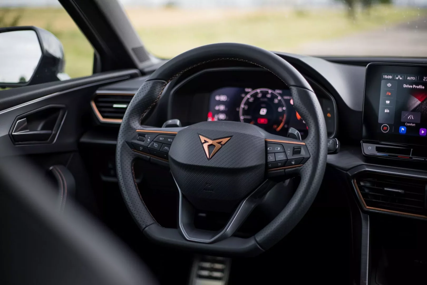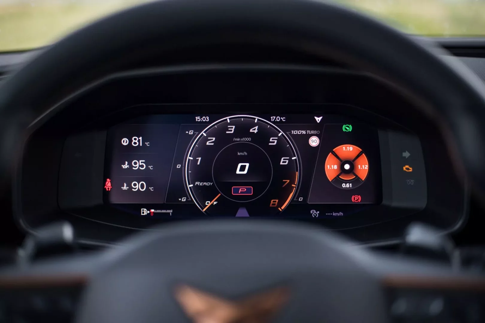 Měděný motiv, který je typický pro značku Cupra, najdete i uvnitř. Jinak trochu černý interiér ozvláštňují právě měděné linie kolem výdechů klimatizace, na výplních dveří nebo obšívání čalounění. Stejnou barvu najdete dokonce i jako znázornění červeného pole otáčkoměru. Hezký a unikátní detail, kterým se Cupra odlišuje od ostatních.
