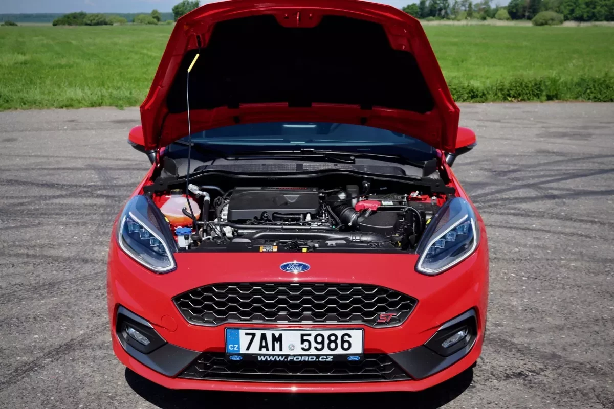 Ford Fiesta ST má pod kapotou „jen“ tříválcový motor o objemu 1,5 litru, nicméně naladěný na 200 vitálních koňských sil a spárovaný se šestirychlostním manuálem s krátkými řadicími dráhami. Jelikož auto váží bez řidiče jen lehce přes 1 200 kilogramů, slibují tabulkové výpočty tučnou porci zábavy a slušnou spotřebu benzinu. Realita je však úplně jiná – na spotřebu nebo technologii vypínání jednoho válce hned zapomenete, po každém startu přepnete na sportovní profil (deaktivuje se spořič emisí stop/start) a zaposloucháte se do hodně decentního bublání výfuku s aktivní klapkou. Malé ST není uřvaným hrubiánem – ani v otáčkách se neprojevuje nijak agresivně, neruší sousedy, je to takový ten malý kluk ze sídliště, co sportuje, baví se, chodí pozdě domů, ale nedělá bordel.