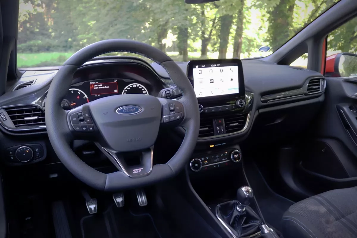 Řízení se za sportovní moc požadovat nedá, odezva od kol ve volantu je nasimulovaná progresivním servořízením, což vzhledem k základní ceně přesahující lehce půl milionu vlastně vůbec nevadí. Svěží vítr do plachet přidává volitelný mechanický samosvorný diferenciál, ten otáčí karty ve váš prospěch a je sakra zábavný. Fiesta ST díky samosvoru kosí zatáčky stejně jako Tomáš Enge ve formuli, nabídne lepší ovladatelnost, případně zkrátí váš okruhový čas. Zprvu se na auto oprávněně koukáte skrz prsty, protože vidíte nablýskaný angličák se skautskými odznáčky ST, jenže po první vyjeté nádrži paliva a zpráskání prakticky většiny běžných aut tomuhle hothatchi přijdete na chuť a pochopíte, proč ho Jeremy Clarkson (ex. Top Gear) vzal místo na okruh do obchodního centra.