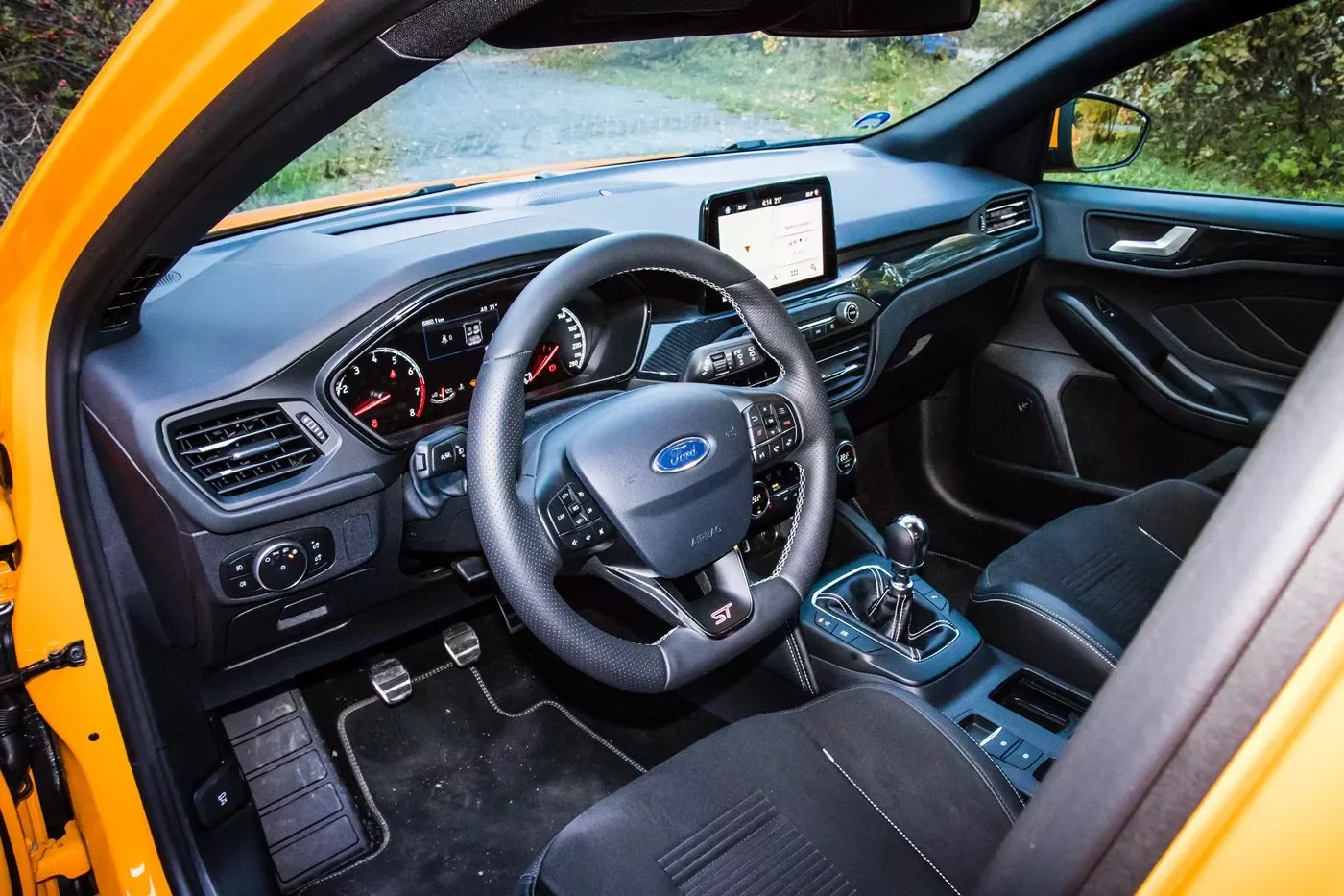 Samozřejmě nepřehlédnete červené logo ST na přední mřížce a spojler na pátých dveřích, ale auto jako celek působí přiměřeně a elegantně. Také jsem po celý týden testování zaznamenával jen pozitivní reakce kolemjdoucích i ostatních řidičů. Ani v interiéru neproběhla žádná revoluce. Kromě tlustšího a skvěle padnoucího volantu, povedených anatomických sedaček Recaro se skvěle integrovanou a přitom nastavitelnou opěrkou hlavy jsou to ještě kovové pedály a hlavice řadící páky a nepřehlédnutelné nerezové ochranné lišty prahů s nápisem Ford Performance.