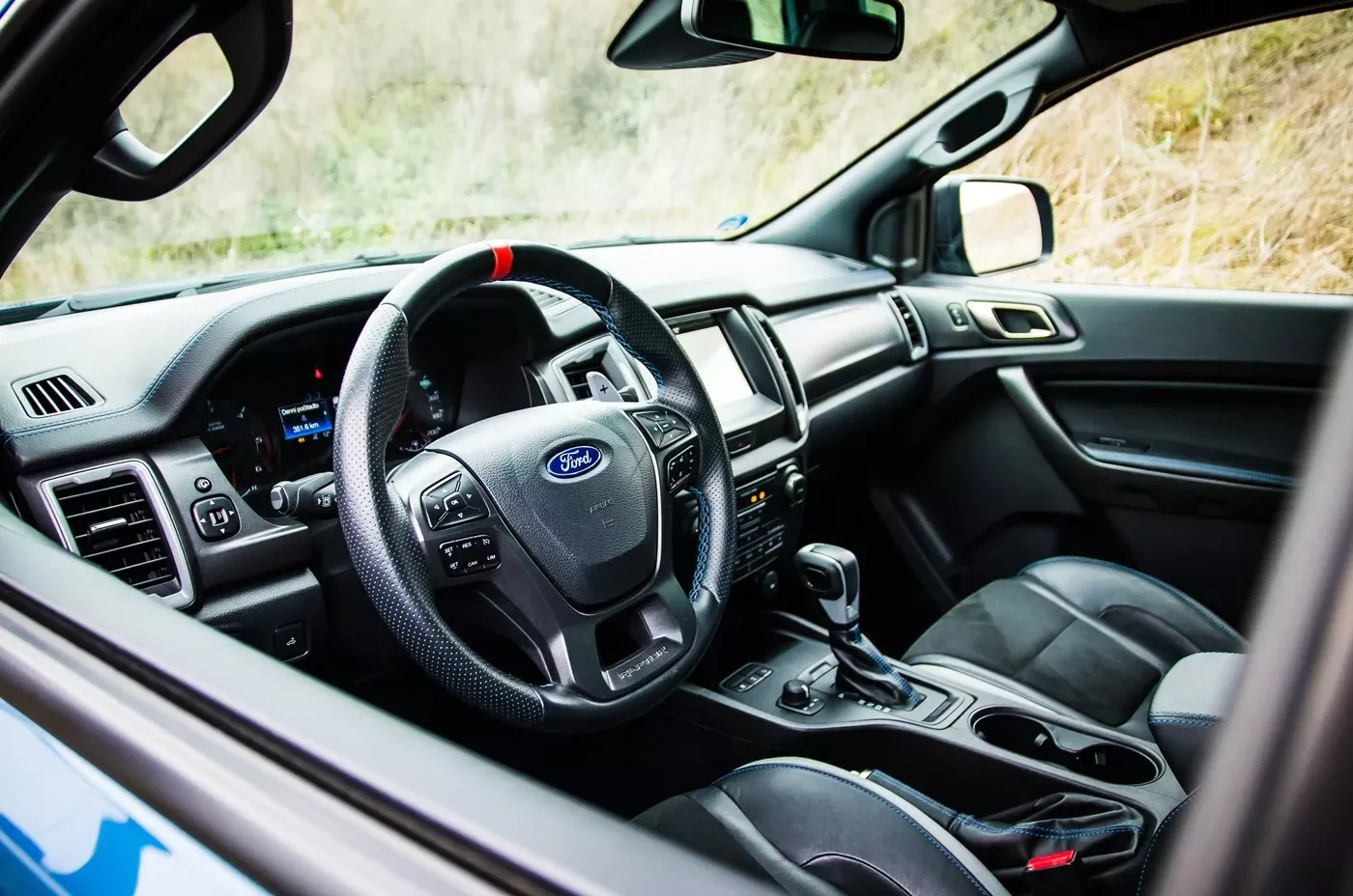 Exteriér Raptoru se od obyčejných Rangerů viditelně odlišuje, zatímco interiér se změnil jen decentně. Uvnitř čtyřdveřové kabiny se odehrálo pouze několik drobných změn, podle kterých okamžitě poznáte, že nesedíte v běžném Rangeru. Červený proužek na vrchu a čalounění sedadel se inspirovalo americkým Raptorem, ale to je všechno. Na délku je interiér prostorný, ale na šířku se při porovnání s vnějšími rozměry může zdát trochu stísněný.