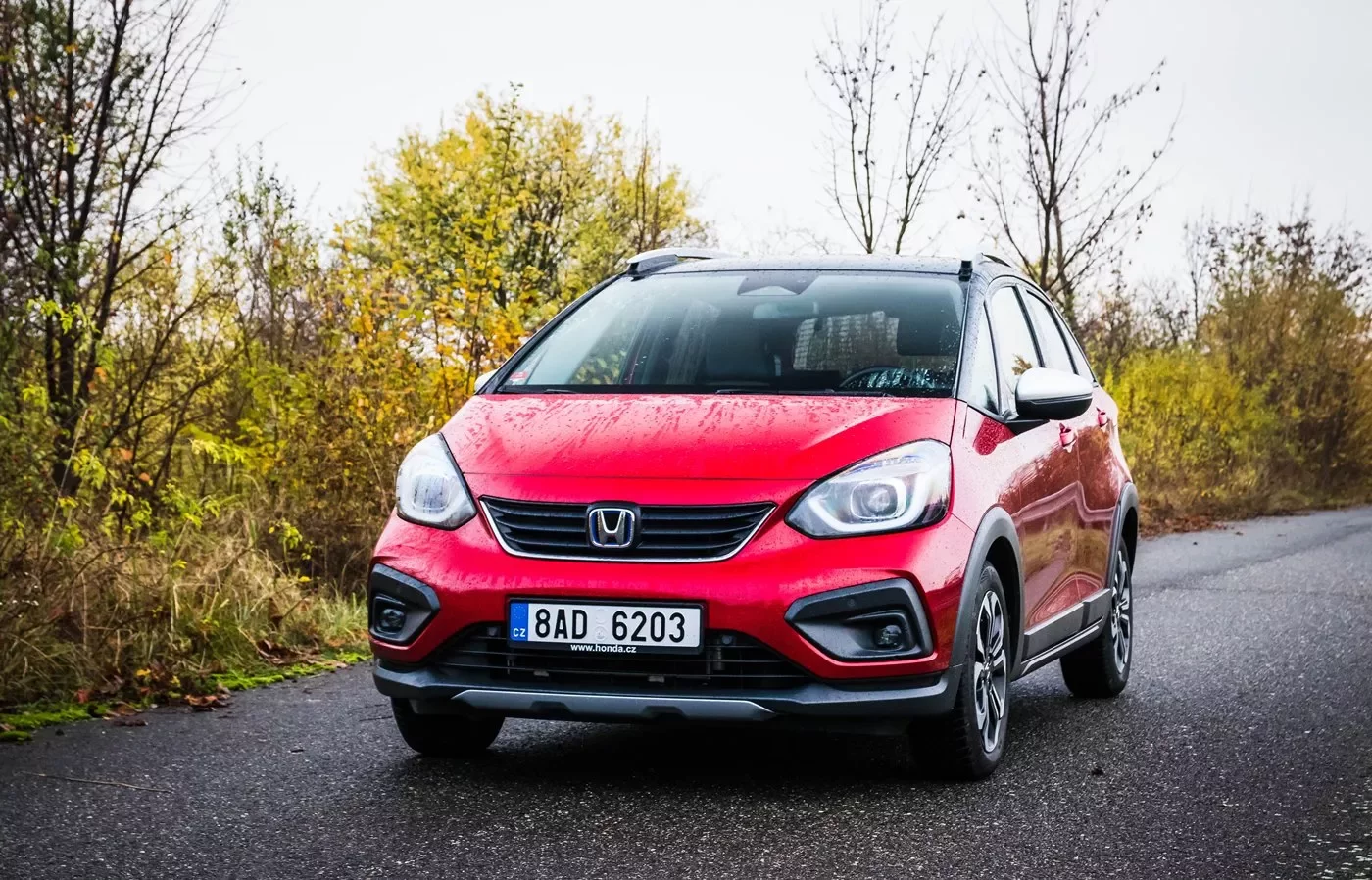 Současná Honda Jazz je stále kompaktním městským pětidveřovým hatchbackem a s plastovými ochrannými prvky působí zajímavým outdoorovým dojmem. Na předním i zadním nárazníku, blatnících a bocích karoserie jsou tmavé plastové nástavce, které u testovaného auta zajímavě kontrastují s červeným lakem karoserie. Jiná jsou také šestnáctipalcová kola a zvýšená světlá výška o 16 milimetrů.