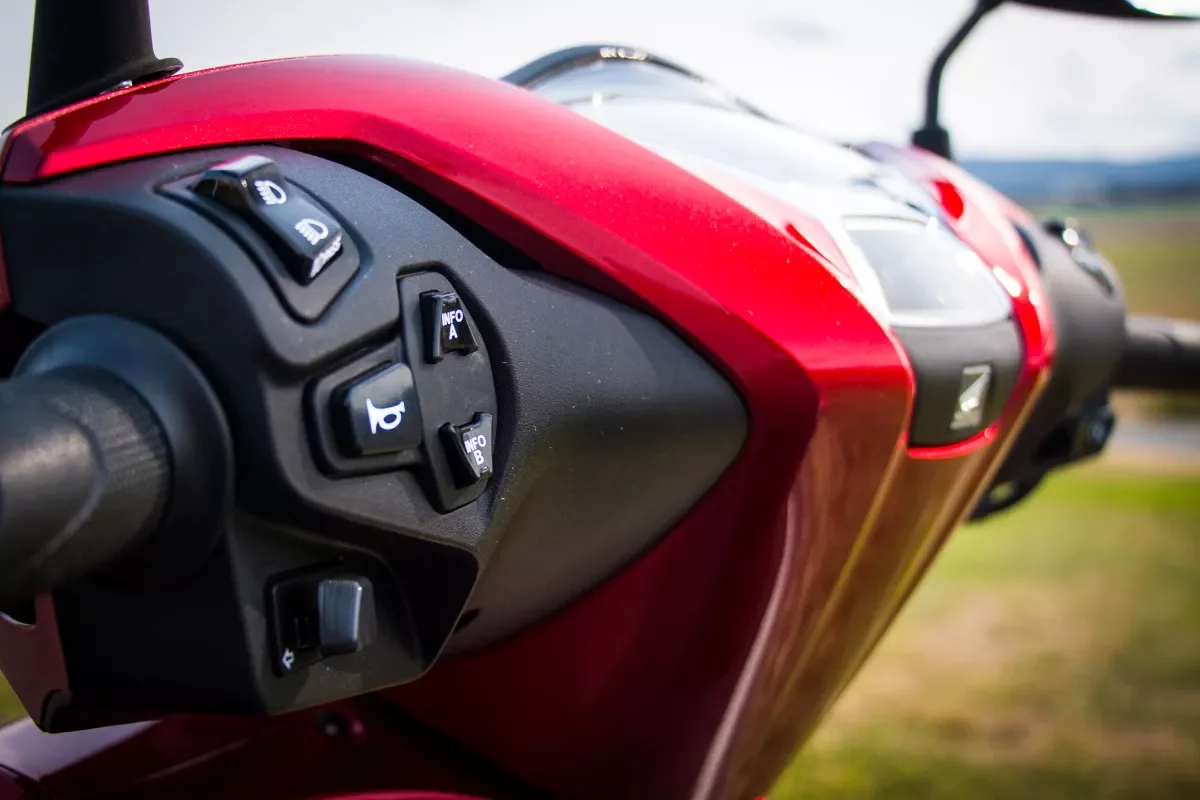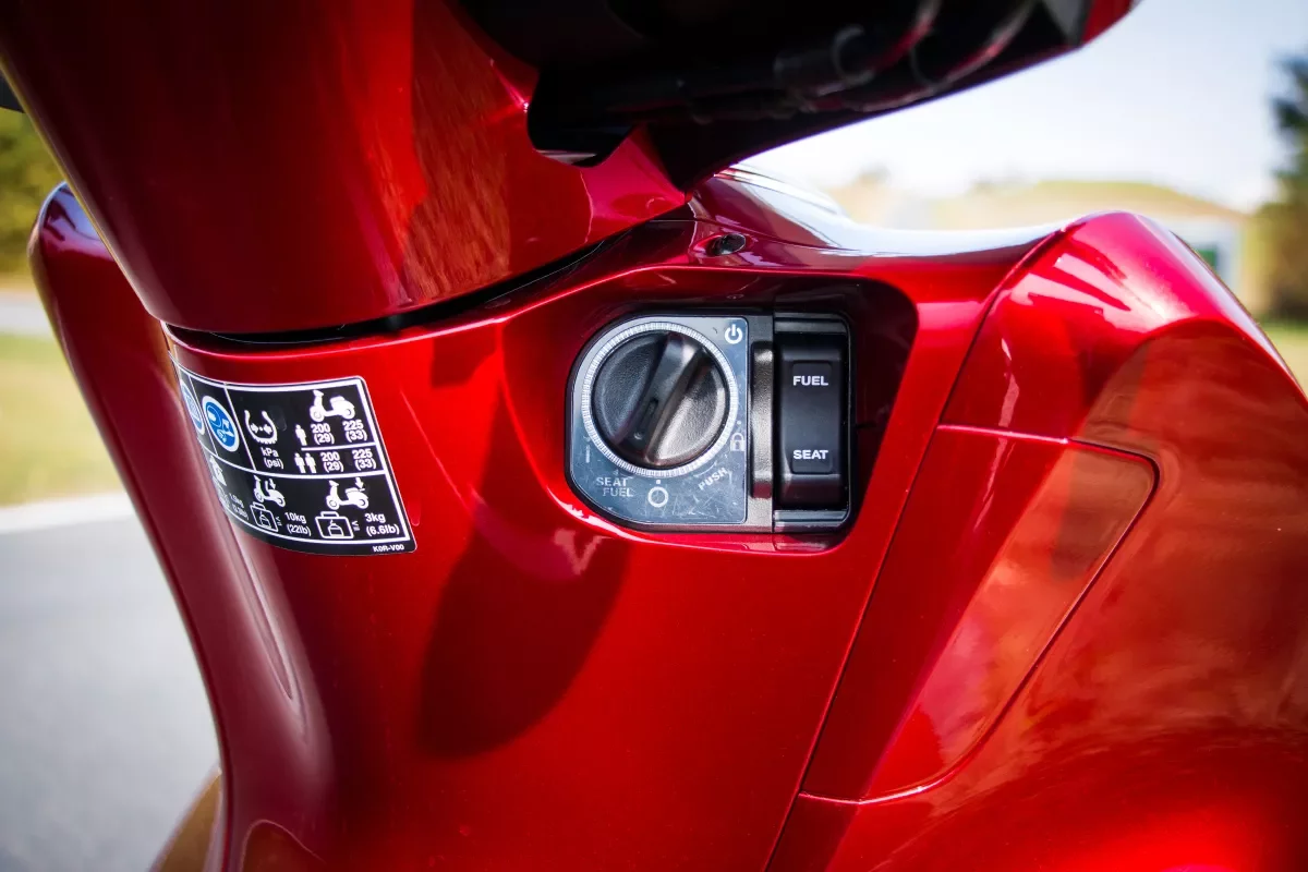 Skvělou novinkou pro modelový rok 2020 je objemnější schránka pod sedlem. Do většího 18litrového prostoru tradičně uložíte integrálku, vedle máte potom navíc 10 litrů na drobnosti a nechybí ani USB zásuvka. Jak sedlo, tak víčko nádrž se otevírá kolébkovým tlačítkem, které se odblokuje po otočení startovacího ovladače.