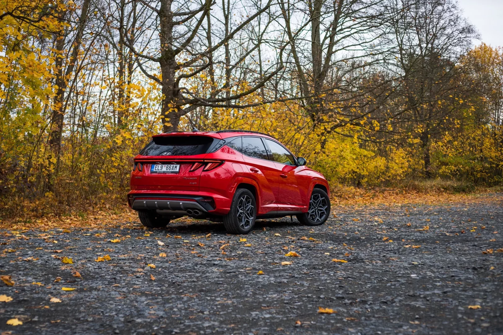 Konkrétně v červeném laku Engine red (bez příplatku) perfektně vyniknou jak 19" kola, vytažená hezky ke krajům podběhů, tak sportovní bodykit, černé lišty a skutečně hodně tmavá zadní okna. Takhle skvěle bude vypadat jak základní N-Line 1.6 T-GDI s přeplňovaným benzinovým čtyřválcem o výkonu 110 kW, tak testovaný špičkový plug-in hybrid se stejně objemným motorem, ale systémovým výkonem 195 kW (132 kW dává spalovací agregát, 67 kW pak elektromotor), automatem a pohonem 4x4. Ten ale stojí už 1 079 990 Kč.