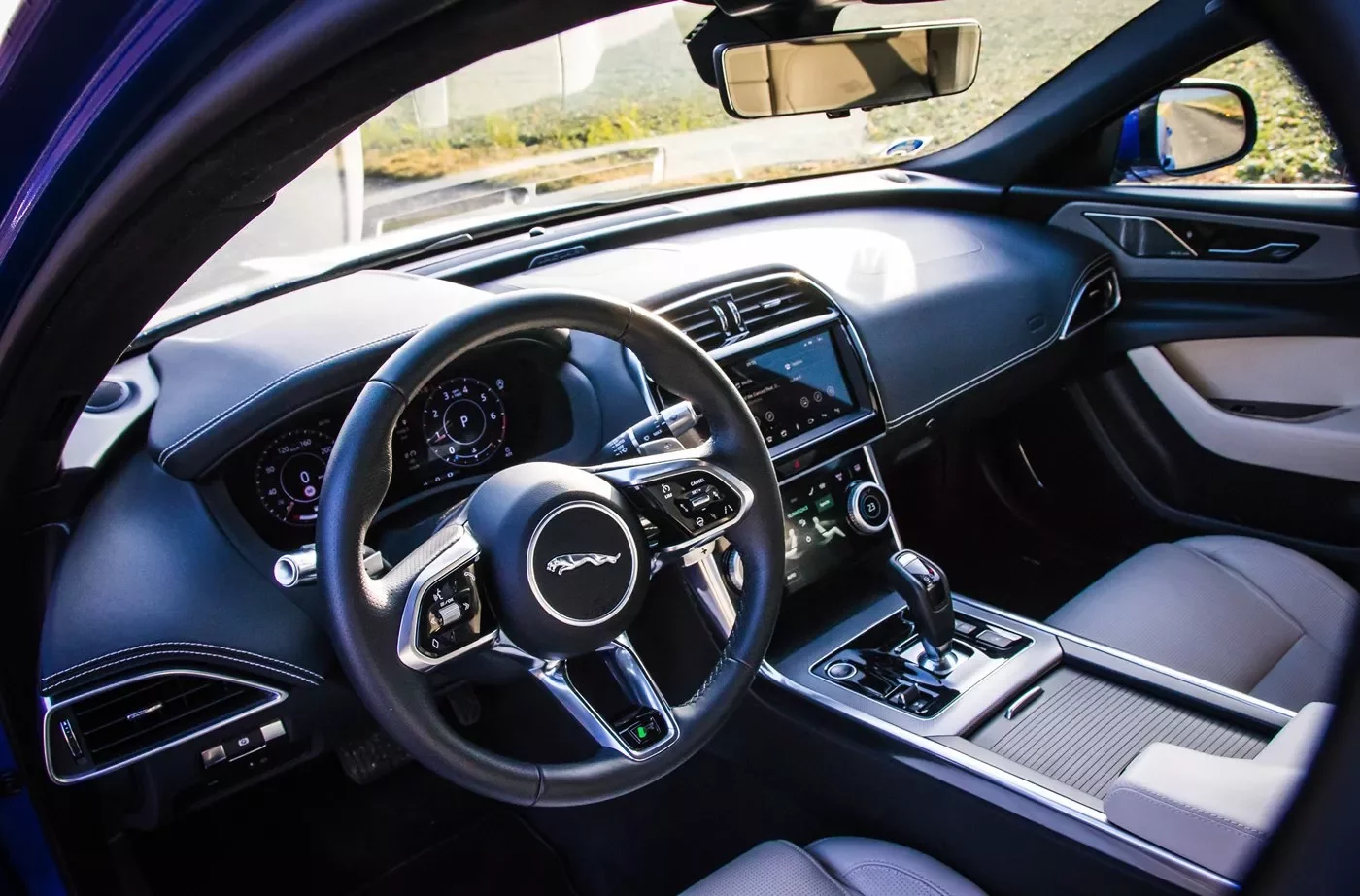 Návrháři Jaguaru při přetváření XE vydali směrem minimalismu, který je patrný nejen zvenčí, ale i uvnitř. Z interiéru zmizela většina běžných tlačítek, která byla nahrazena dotykovými. Zastaralé ručičkové ukazatele nahradil digitální přístrojový štít a nejmodernější technologie jsou doplněny digitálním zpětným zrcátkem, jehož obraz nahrává kamera umístěná v ploutvičce v zadní části střechy. Obraz virtuálního zrcátka je plynulý a ostrý, ale zkresluje odhad vzdálenosti za autem. Naštěstí lze zrcátko „přepnout“ na běžný odraz pouhým překlopením.