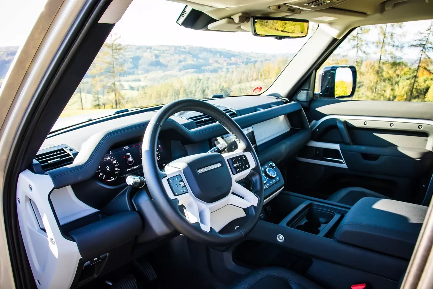 Lidé se zkušenostmi se starým Defenderem si rychle uvědomí obrovskou prostornost a komfort v interiéru. Volant už není vyosený, pedály nejsou natlačené ke straně a na sedadlo řidiče se pohodlně usadíte, aniž byste si museli stáhnout okno a vytvořit tím prostor pro váš levý loket. Pohodlím v interiéru se Defender blíží sourozencům značky Range Rover. Ve výbavě interiéru nechybí elektrické vyhřívání sedadel a volantu, digitální přístrojový štít, rychlý a přehledný infotainment, chladicí box pod loketní opěrkou, digitální zpětné zrcátko nebo spousta elektronických asistentů pro jízdu na silnicích i v terénu.