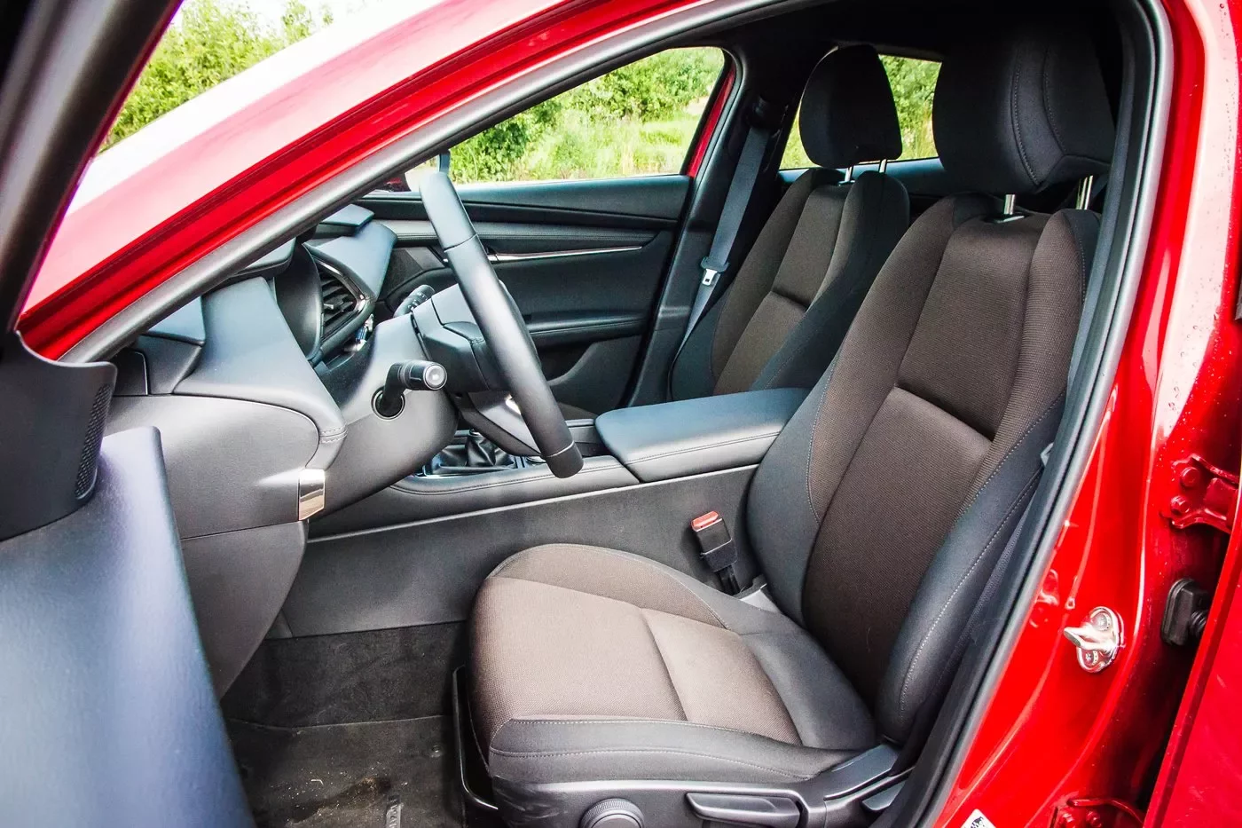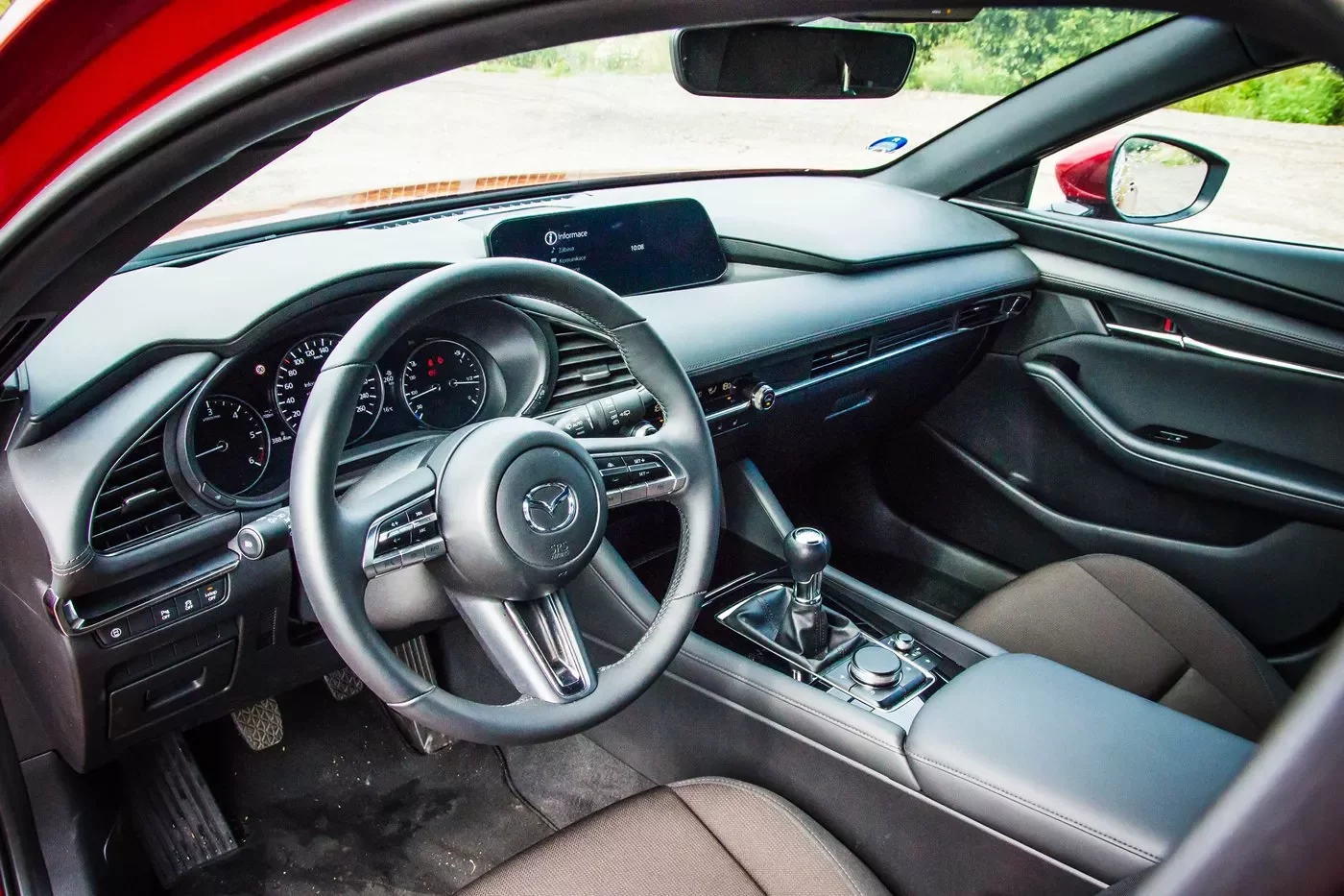Nízká střecha a okna mohou zpočátku působit stísněným dojmem, ale obzvláště fanoušky sportovních aut to po chvíli začne bavit. I díky tomu je pozice za volantem až zapadlá, čemuž napomáhá vysoko umístěný volant. Rozmístění pedálů blízko u sebe navíc dovoluje řidičskou techniku pata-špička, což dokazuje, že tým vývojářů zodpovědný za novou trojku skutečně baví řídit. Mazda opět zhmotnila vlastní marketingový výraz Jinba Ittai, který hovoří o pomyslném dokonalém spojení jezdce a koně.