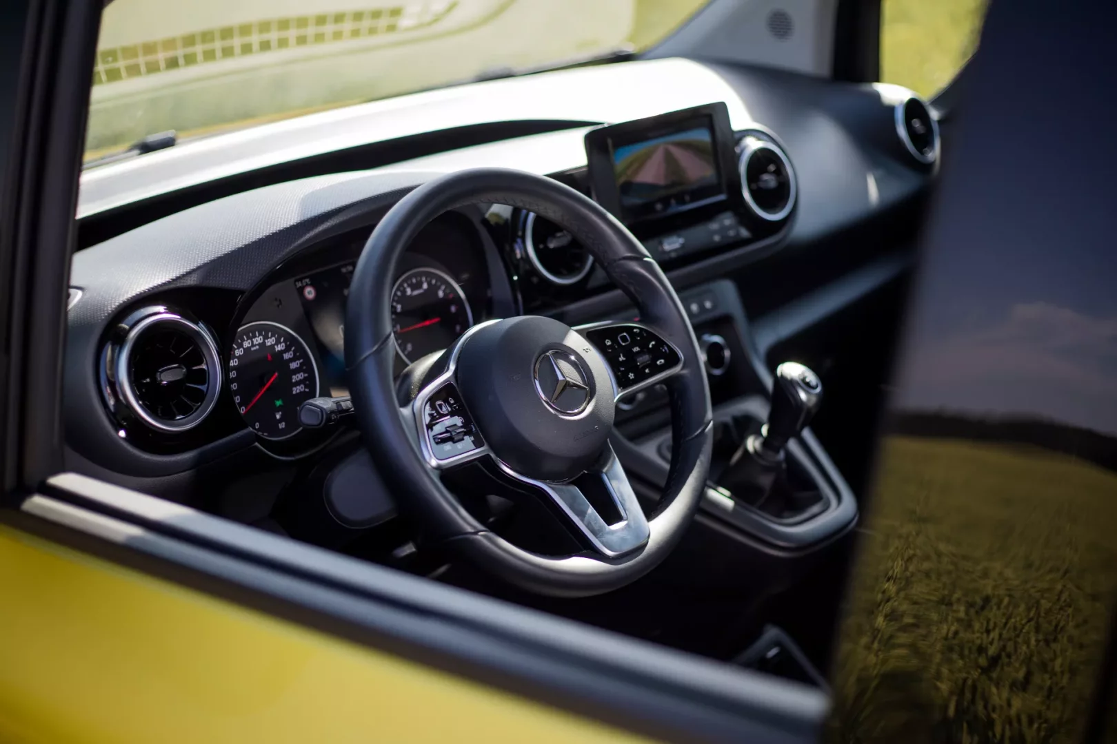 Uvnitř je to na pohled také typický Mercedes. Přestože základ interiéru Citan sdílí s Kangoo, volant, budíky, výdechy klimatizace, multimediální systém MBUX nebo levá páčka blinkrů s typickým mercedesím ovládáním stěračů pozvedávají kabinu levné francouzské dodávky na vyšší úroveň.