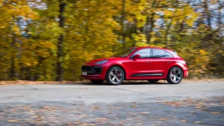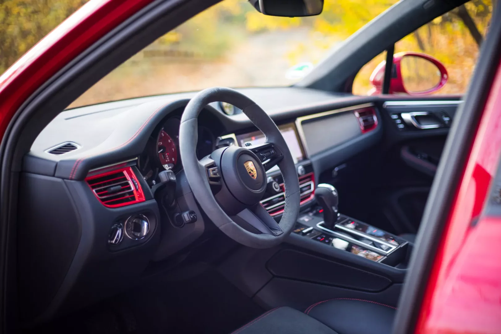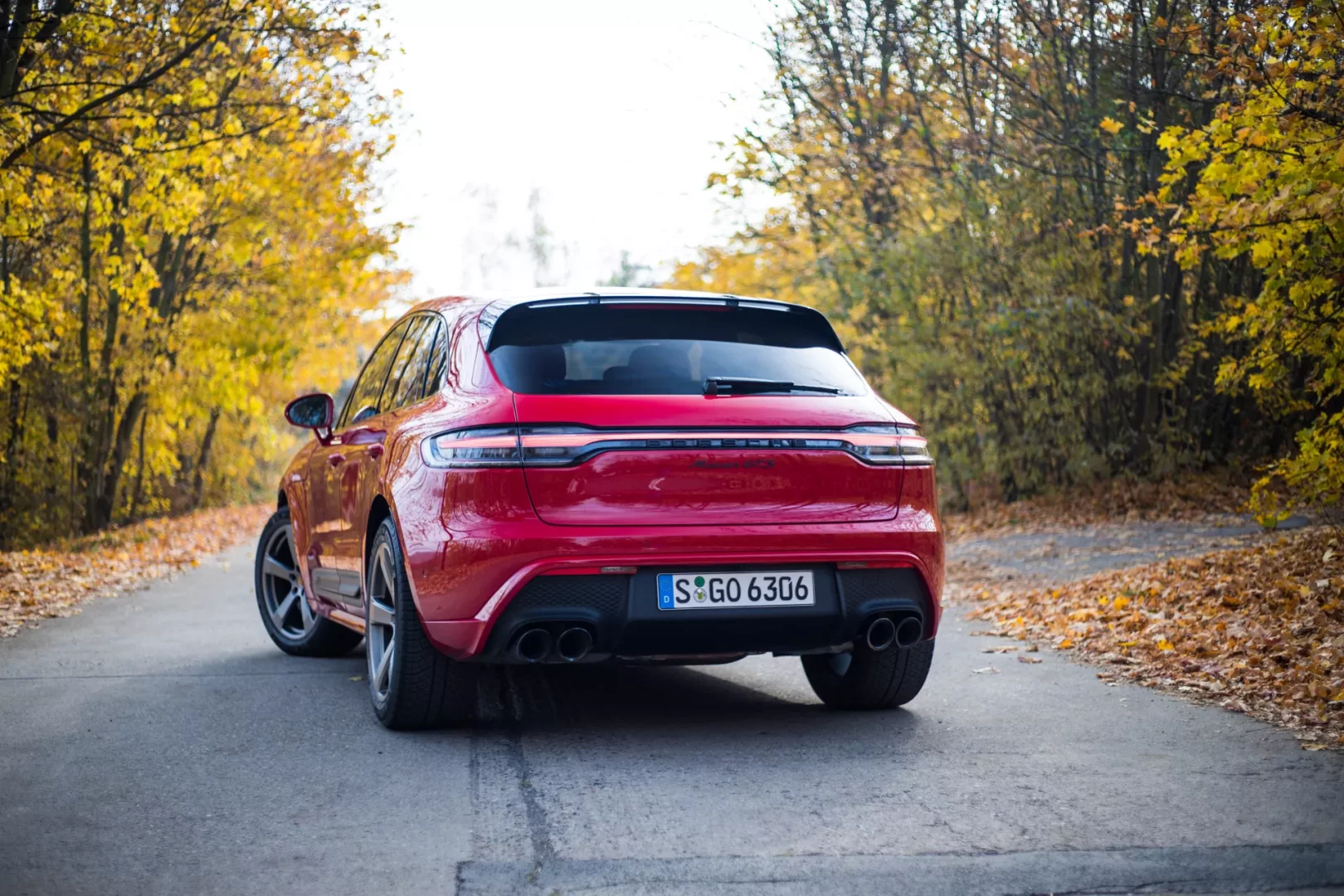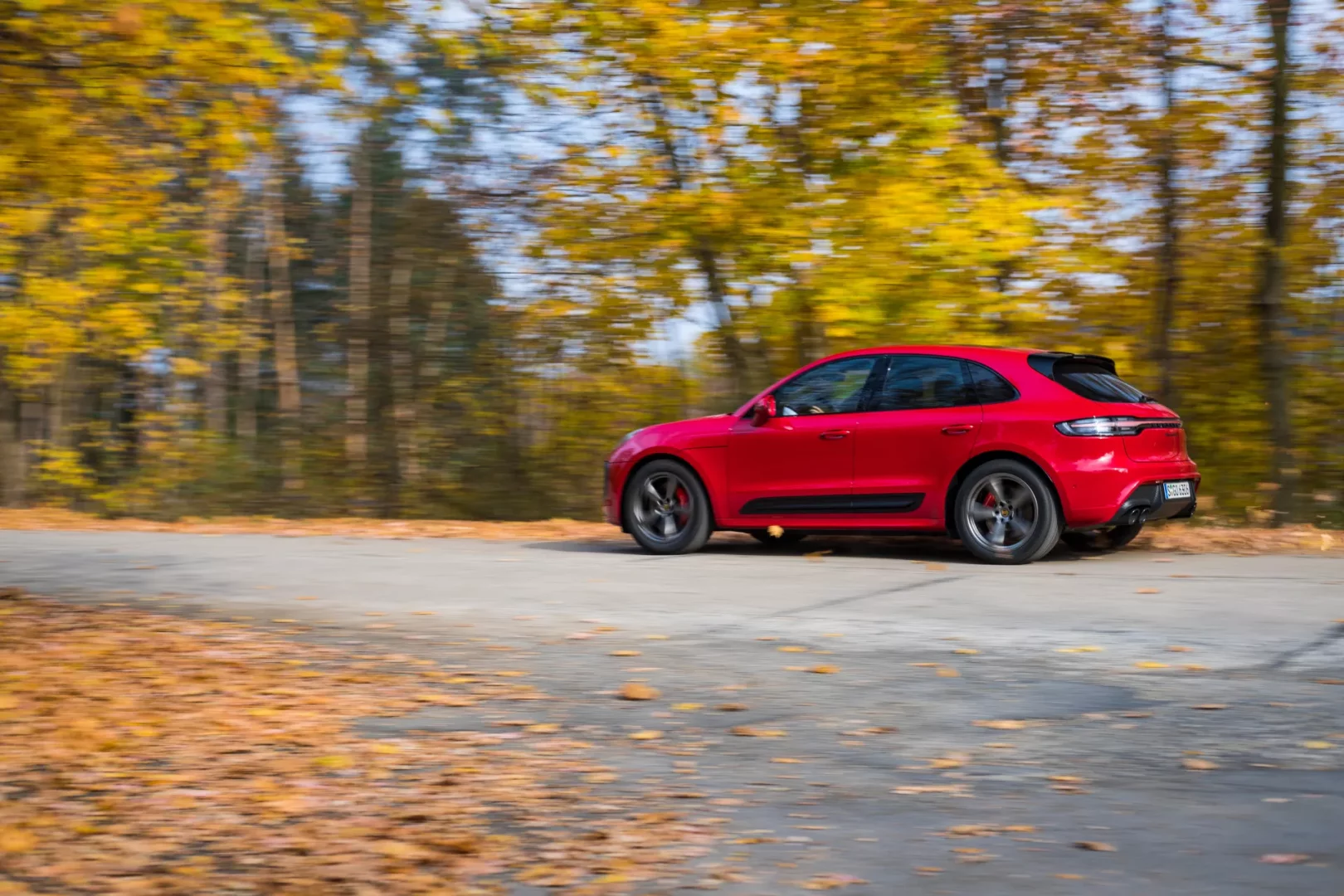 Porsche Macan GTS představuje skutečný univerzál v kompaktním balení. Nebudete s ním nikoho provokovat ani v naší nádherné červené barvě Carmine Red doplněné černými detaily a litými 21“ koly, které vzadu můžou obouvat pneumatiky šířky až 295 mm. To je v kombinaci s užšími předními plášti (265 mm) bohužel zdrojem určitého neklidu ve vyjetých kolejích, na což si je třeba zvyknout.