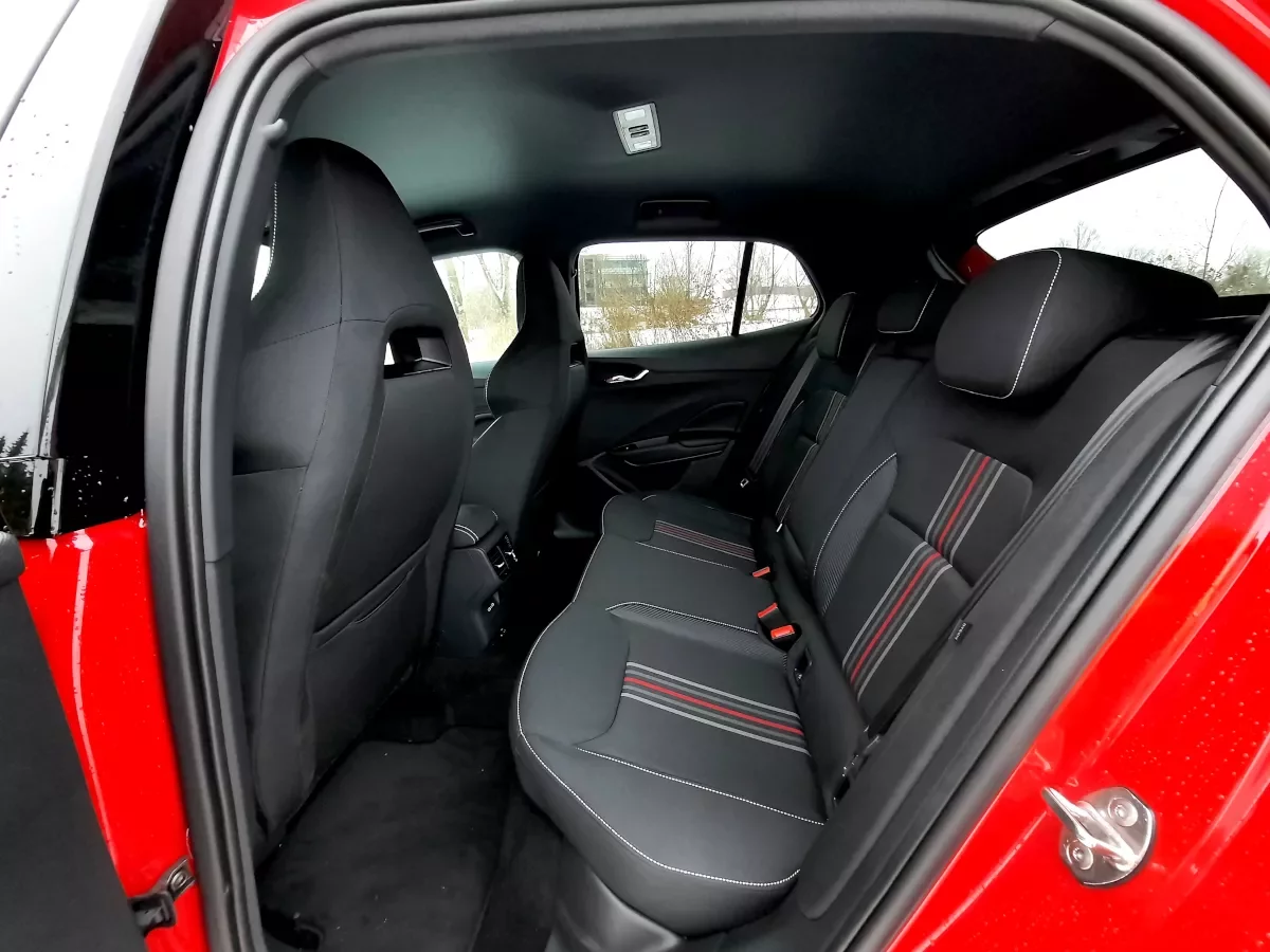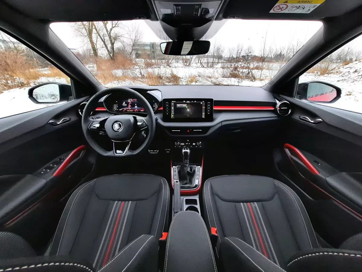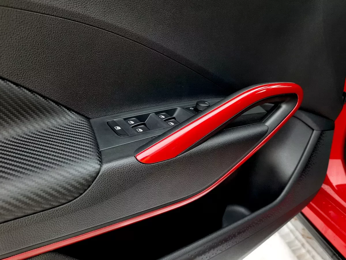 Uvnitř je auto stejné jako zvenku. Na pohled velmi stylové a sportovní. Prim hrají černá sportovní sedadla s červeným pruhem a nastavitelnou výškou, tříramenný sportovní volant a „karbonová“ přístrojovka. Černě laděnému interiéru neskonale sluší ona červená linka, která prostupuje celou přední částí a dostává se i k obtékání středového tunelu, stejně jako k madlům na dveřích. Ostatně onen pocit při usednutí je velmi specifický – celé to sezení, vaše ruce na volantu a 10,25palcový virtuální kokpit, který si lze nastavit do několika „náhledů“, vybízí k živočišné jízdě plné zábavy. Dlouho jsem neměla z vnitřku auta takový dojem, jako kdybych s ním sama dokázala zajet rallye trať.