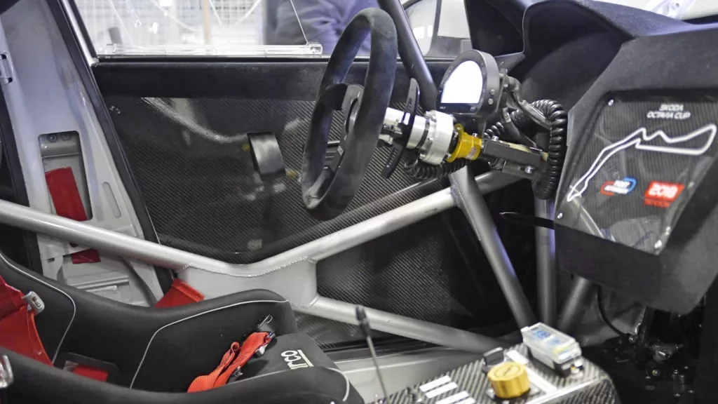 Hned ovšem narážím na jeden problém – svoji výšku. Tedy ne že bych se do Octavie nevešel, naopak, sedačku mám hodně daleko od volantu i pedálů, takže se ke slovu hlásí mechanici, kteří mi sedačku posouvají. Jakmile prolezu nevelkým otvorem mezi střechou a bezpečnostním rámem, nasoukám se do skořepinové závodní sedačky a zapínám si šestibodové bezpečnostní pásy. Dotahuji si popruhy a nemohu se už pohnout o jediný kousíček.