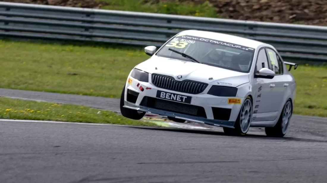 V následující technické pasáži opatrně zkoumám, jak Octavia snáší větší pobídnutí volantem. Zjišťuji, že jsem hluboko pod limitem. Hrubější výjezd z vracečky mi ovšem ukazuje, že pneumatiky stále ještě nejsou připravené a navzdory kousavému samosvornému diferenciálu, který pomáhá přenést výkon na asfalt, chci po studených předních gumách zatím ještě příliš. Přichází ďolík a rychlá zatáčka do kopce, ze které mám pokaždé obrovský respekt. Lidé z týmu mě také upozorňovali, že na čerstvém povrchu, který v Mostě teprve nedávno položili, to tady ještě pořád klouže.