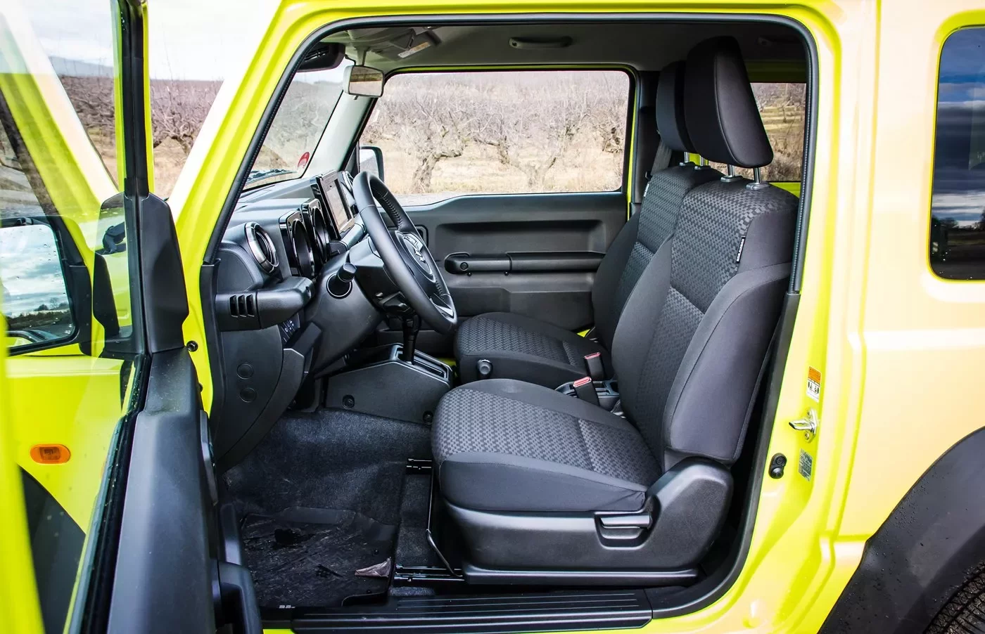 Jednoduchý a přímočarý interiér je vyroben z trvanlivých tvrdých plastů, které jsou v běžných autech ošklivé a nepřijatelné, ale v levném Jimny jsou pochopitelné. Interiér je laciný, ale v nejvyšší specifikaci Elegance nabízí bohatou komfortní a bezpečnostní výbavu. Plně vybavené Jimny nestojí více než půl milionu korun a přitom nabízí vyhřívání předních sedadel, automatickou klimatizaci a infotainment s navigací a konektivitou Apple CarPlay a Android Auto. Když už jsme u výbavy, kulaté přední světlomety jsou vybaveny moderní LED technologií a svítí opravdu fantasticky.