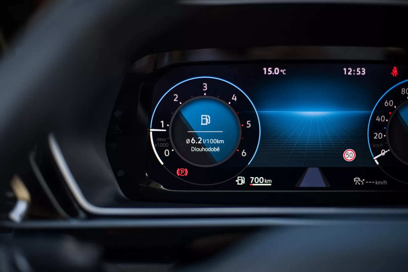 Přes multifunkční kožený volant pak na vás vykoukne příjemný digitální přístrojový štít obložený leštěným plastem, na který plynule navazuje 8,5palcový displej infotainmentu.