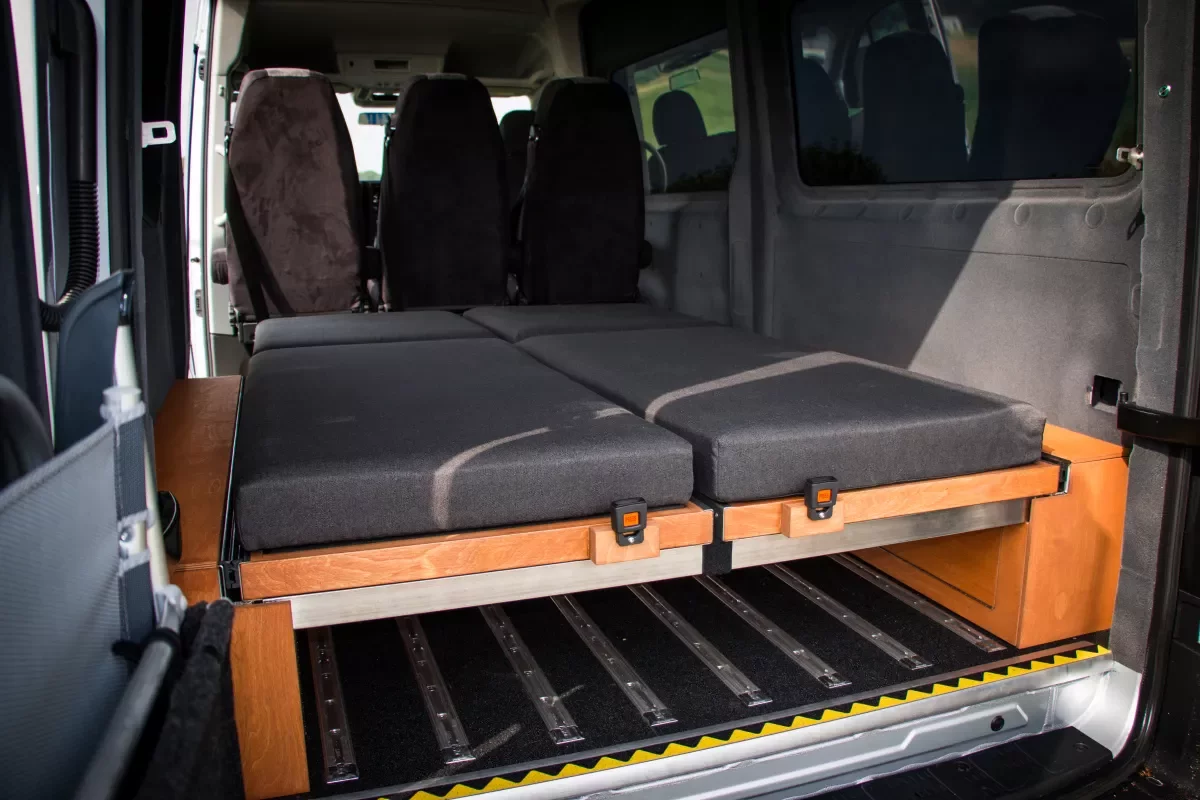 I to je možné. Vždyť říkám, že je Crafter všeuměl. Stačí jenom sáhnout po Crafteru Kombi s lůžkovou vestavbou od české společnosti Sicar a máte auto 3 v 1. „Obytná“ vestavba je tu řešena sklopnými rošty postele, která zaujímá zadní část prostoru. Stále tak odvezete šestici pasažérů.