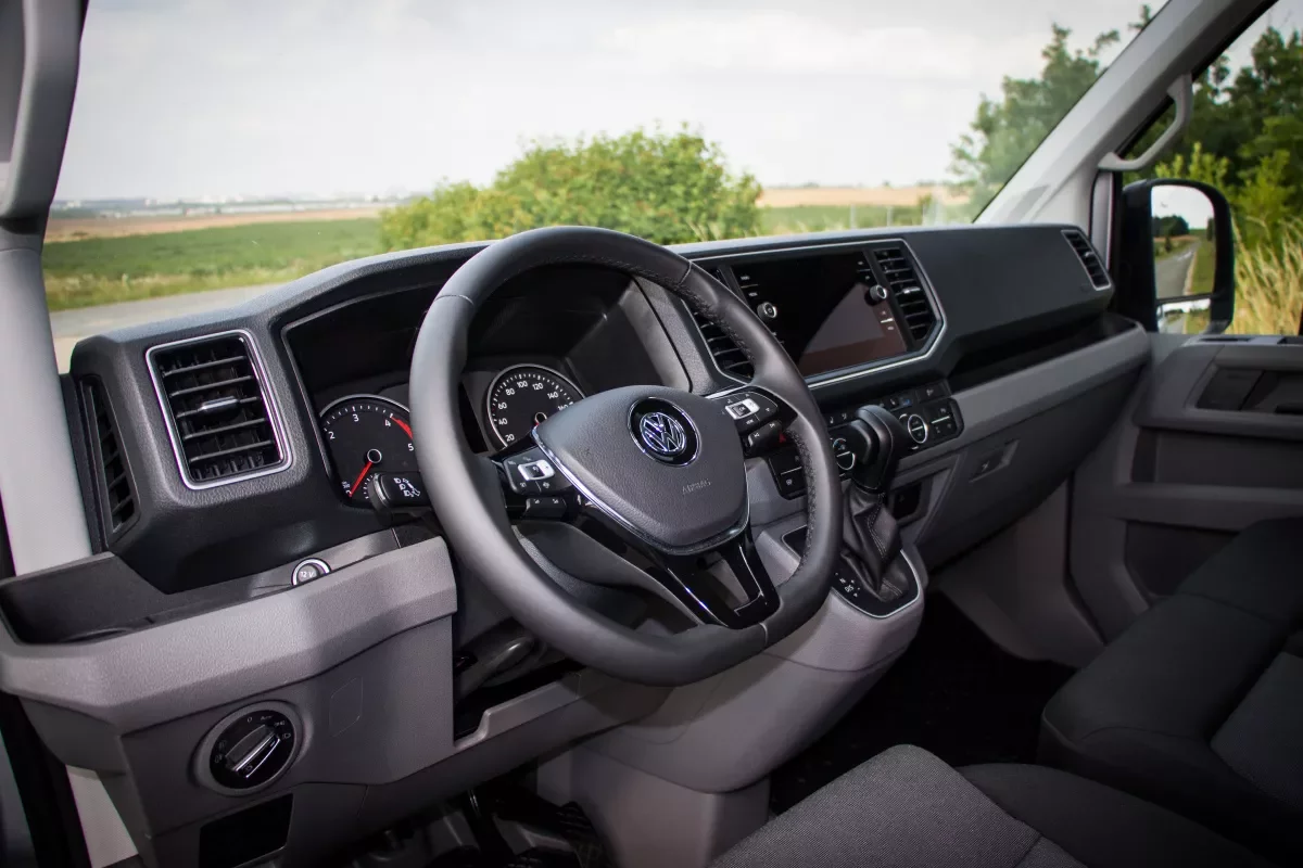 Jinak je to normální osobní Crafter. Uvnitř je to velice hezké auto, celý interiér je potažený tapecírunkem, takže nikde nekoukají plechy a ani sváry. Je to provedené velice hezky a útulně. Palubní deska je také pohledná, ačkoliv svůj původ v dodávce nezapře – vše je z tvrdých plastů, které jsou ovšem na oko líbivé.