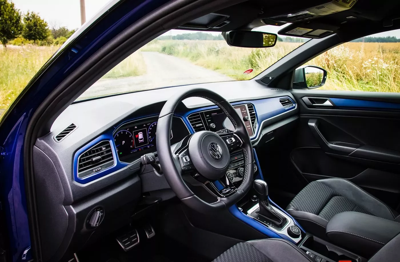 Věřím tomu, že rychlost, zběsilost a odhodlání T-Rocu R překvapí nejednoho řidiče. Opravdový potenciál vozu si uvědomíte až při pohledu na titanový výfuk Akrapovič, který Volkswagen nabízí jako součást továrně montované příplatkové výbavy. Z pohledu řidiče to ale bohužel není tak vzrušující, protože interiér nevypovídá nic o tom, že tohle auto umí rozpoutat malé peklo. Jedinou opravdu výraznou změnou oproti obyčejné verzi je sportovní volant z Volkswagenů R-Line, modrý dekor a sportovní sedadla z Golfu.